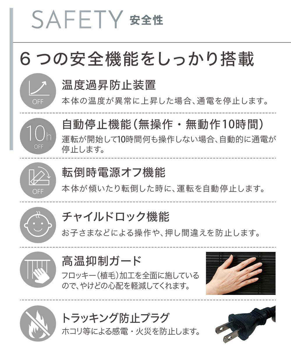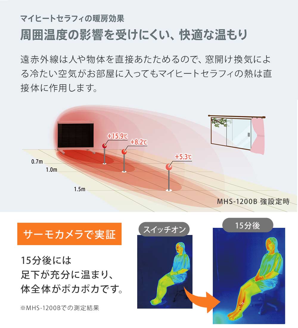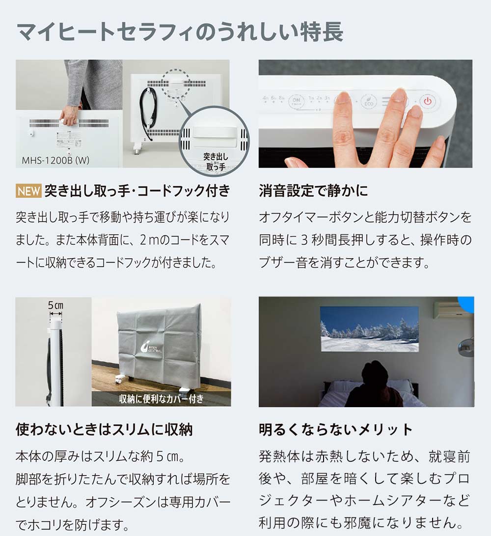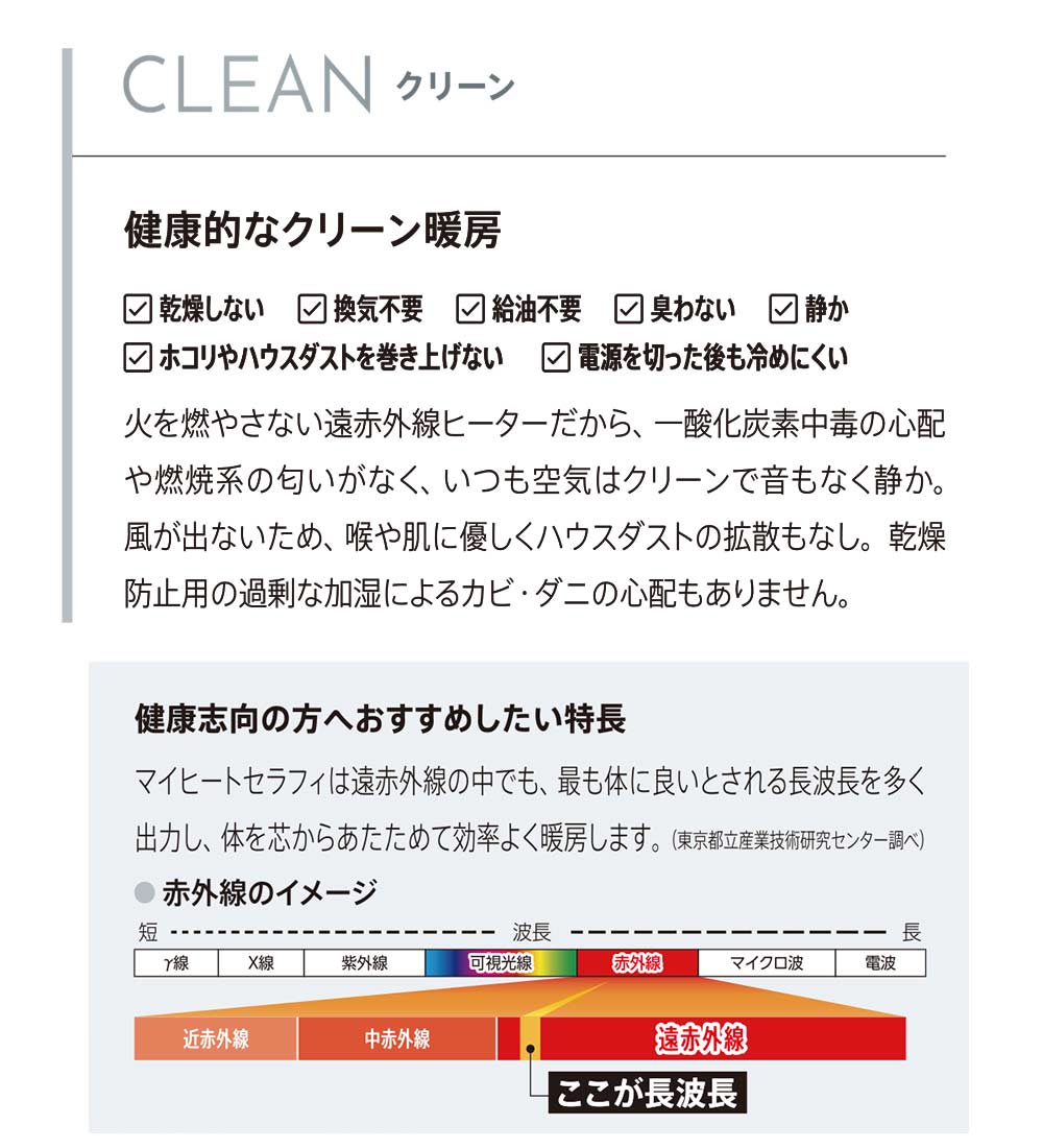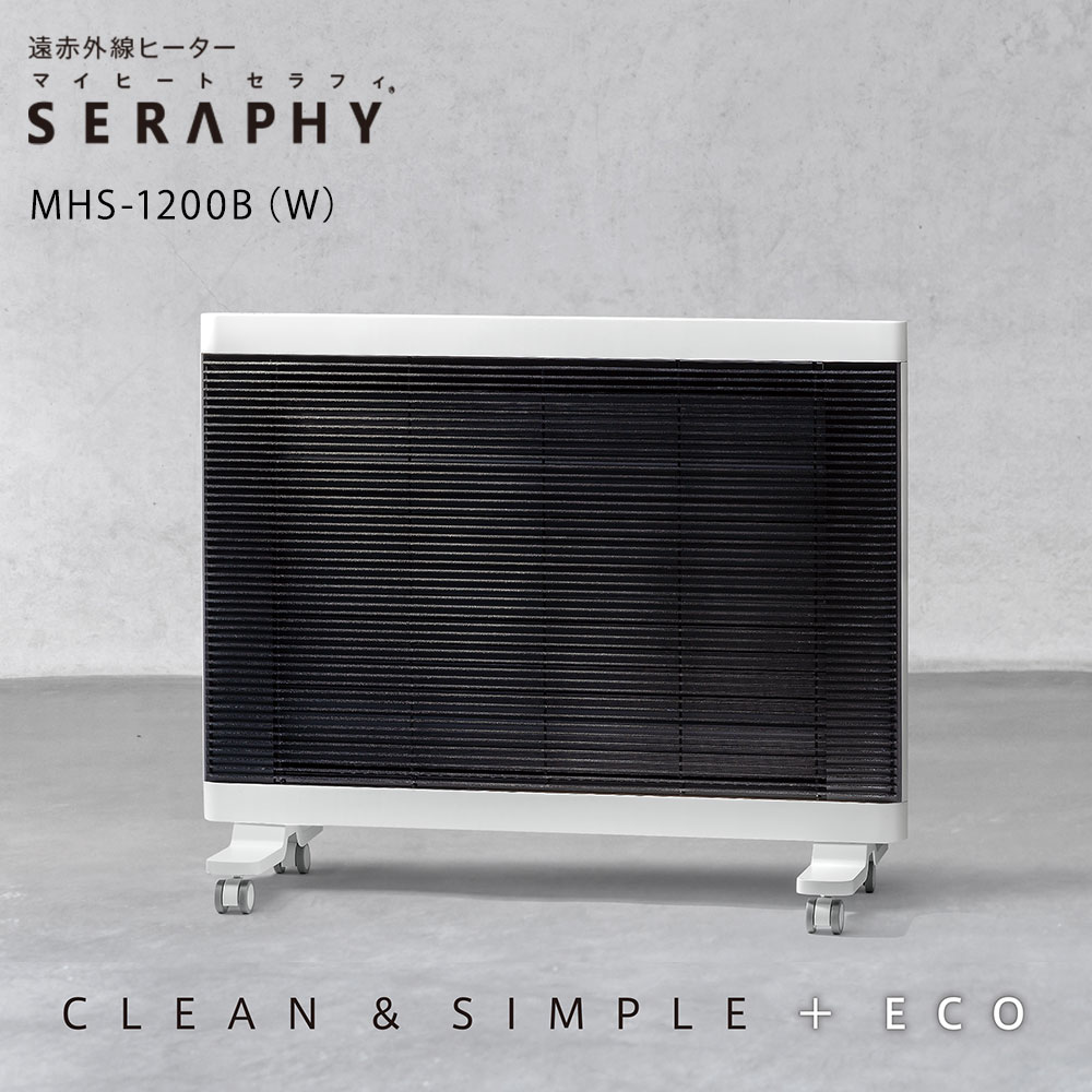 サイズ約 幅714×奥行309×高さ594mm(脚部含む)電源単相 AC100V 50/60Hz消費電力1200AW最大放熱量4320kJ/h(1032Kcal/h)適用畳数4~8畳※高気密・高断熱住宅の場合で、地域や部屋の断熱性・気密性により異なります。重量8.9kg能力切り替え3段階切替(強:1200W 中:1000W 弱:600W)タイマーオフタイマー (1時間・2時間・3時間)オンタイマー (4時間・6時間・8時間)安全装置温度過昇防止装置転倒時電源オフ機能自動停止機能(無操作・無動作8時間)チャイルドロック機能電気代強:約37.2 円、 中:約31 円、 弱:約18.6円、ECO運転付属品保証書(メーカー保証3年間)、取扱説明書、専用カバー製造元インターセントラル生産国中国備考●コード長:2.0m(トラッキング防止プラグ付)陽だまりのような暖かさ太陽の光を全身に浴びた時の気持ちよさ。それは太陽光線に含まれる遠赤外線が、私たちの身体を芯から温めてくれるから。赤外線ヒーター「マイヒートセラフィ」は、身体を直接温めながら、お部屋の壁や床・天井、家具なども温めます。まるで陽だまりのような自然な暖かさをご体感いただけます。空気がきれいで臭わない、静かで風を引き起こさない、快適な暖かさ。