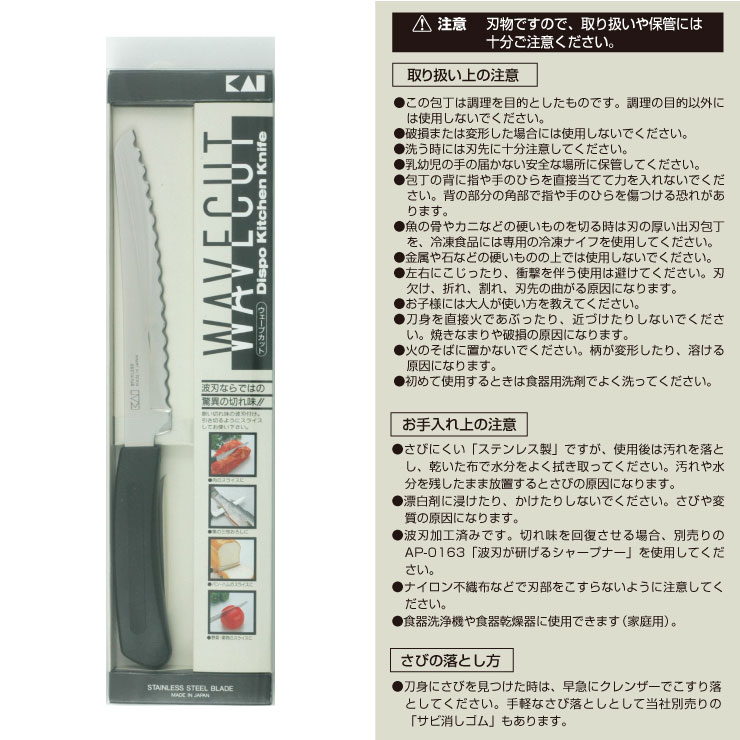 サイズ約26.7×2×2.5cm重量約110g材質刀身:ステンレス刃物鋼(刃付け形状/波刃付け)柄:ポリプロピレン(耐熱温度110℃)製造元貝印生産国日本備考食器洗浄機、食器乾燥機対応波刃ならではの驚異の切れ味。鋭い切れ味の波刃付け。引き切るようにスライスしてお使いください。肉のスライス、魚の三枚おろし、パン・ハムのスライス、野菜・果物のスライスなどに。波刃加工のナイフです。切れ味を回復させる場合、別売りの「波刃が研げるシャープナー」をご利用ください。