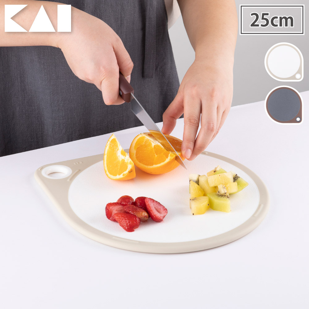 サイズ約290×250×10mm材質本体:ポリプロピレン(耐熱温度100℃)縁部:熱可塑性エラストマー(耐熱温度100℃)重量約372g製造元貝印生産国台湾奥行きたっぷりのひろい作業スペースが魅力なまるいまな板奥行きたっぷり、ひろく使えるまるいまな板。複数の食材の下ごしらえも、まな板上で行うことができ、洗い物も軽減できます。また直線部分を設けることで転がりにくく倒れにくい、立てかけ収納が可能な形状になっています。裏表で異なる表面加工が施されているため、表面では野菜を切り、裏面では肉を切る、というように使い分けることができます。全周をエラストマーで覆っているため、軽くてもまな板が滑りにくく、食材を切る際のストレスが軽減されます。食洗機対応なので、お手入れしやすく清潔にお使いいただけます。