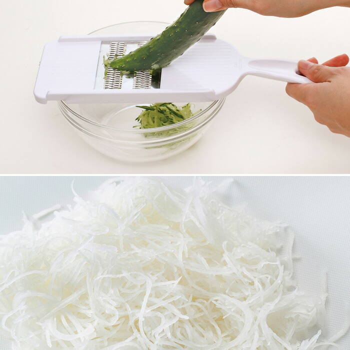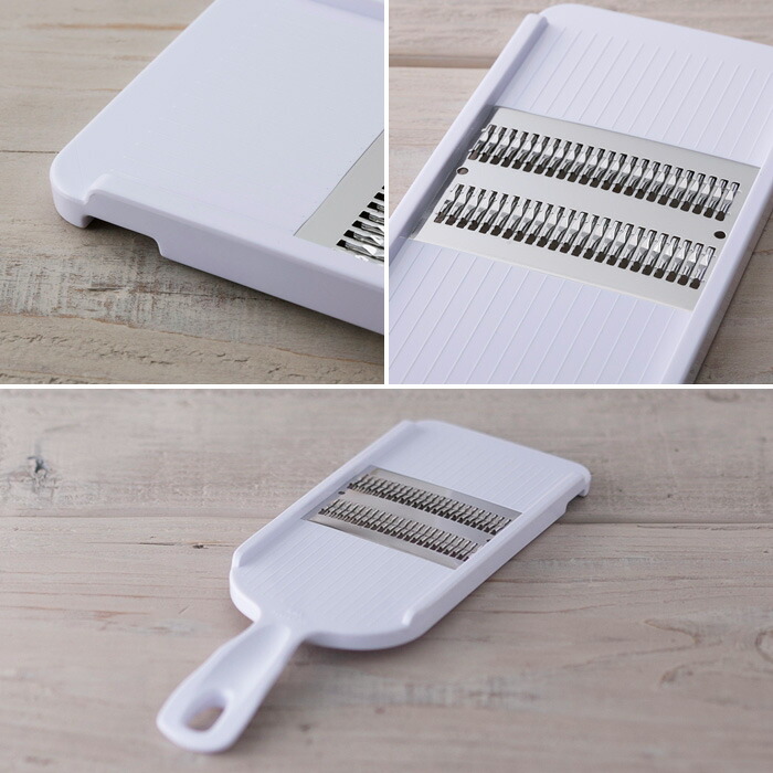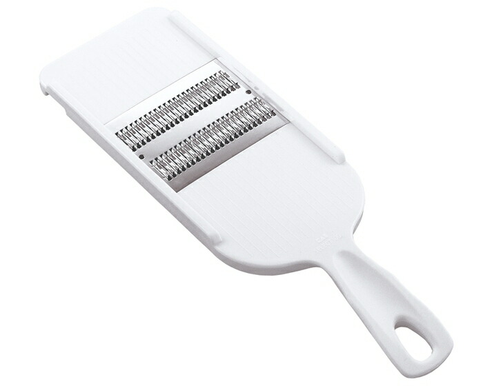型番000DH3004サイズ278×92×19mm材質金属部:ステンレススチール本体:ABS樹脂 (耐熱 100℃)重量約 138g商品説明お刺身のツマに最適な太さ(約1.5mm)のせん切りができます。押しても引いても軽い力でせん切りができるので、面倒な野菜の下ごしらえがスピーディーに。切れ味のよい四角形の刃で作ったせん切りは、丸い刃のせん切り器で作ったものと比べて包丁で切ったものに近く、歯ざわりがよくなります。手首の負担軽減のため、ハンドルに角度がついています。また、受け皿をおろし器と兼用できます。特長毎日使う調理道具に、使いやすさを高めるこだわりを込めました。シンプルで機能的な「SELECT100」のイメージを継承しながら、ひとつ上の質感をもたせたシリーズです。製造元貝印生産国中国備考SELECT100 Kai housewaresシリーズ食洗機使用可能型番000DH3004サイズ278×92×19mm材質金属部:ステンレススチール本体:ABS樹脂 (耐熱 100℃)重量約 138g商品説明お刺身のツマに最適な太さ(約1.5mm)のせん切りができます。押しても引いても軽い力でせん切りができるので、面倒な野菜の下ごしらえがスピーディーに。切れ味のよい四角形の刃で作ったせん切りは、丸い刃のせん切り器で作ったものと比べて包丁で切ったものに近く、歯ざわりがよくなります。手首の負担軽減のため、ハンドルに角度がついています。また、受け皿をおろし器と兼用できます。特長毎日使う調理道具に、使いやすさを高めるこだわりを込めました。シンプルで機能的な「SELECT100」のイメージを継承しながら、ひとつ上の質感をもたせたシリーズです。製造元貝印生産国中国備考SELECT100 Kai housewaresシリーズ食洗機使用可能お刺身のツマに最適な太さの細せん切り器お刺身のツマに最適な太さ(約1.5mm)のせん切りができます。押しても引いても軽い力でせん切りができるので、面倒な野菜の下ごしらえがスピーディーに。切れ味のよい四角形の刃で作ったせん切りは、丸い刃のせん切り器で作ったものと比べて包丁で切ったものに近く、歯ざわりがよくなります。手首の負担軽減のため、ハンドルに角度がついています。また、受け皿をおろし器と兼用できます。SELECT100 kai housewares毎日使う調理道具に、使いやすさを高めるこだわりを込めました。シンプルで機能的な「SELECT100」のイメージを継承しながら、ひとつ上の質感をもたせたシリーズです。