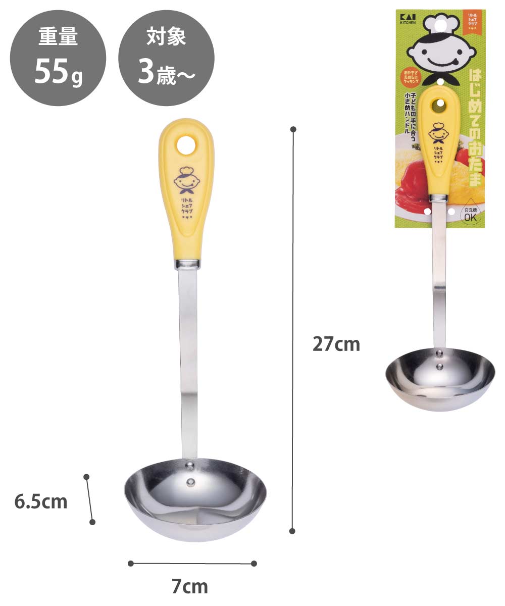 サイズ約270×70×65mm材質金属部:ステンレススチールハンドル:ポリプロピレン(耐熱温度110℃)重量約55g製造元貝印生産国日本備考対象年齢:3歳以上子どもの手に合った小さめのハンドルでしっかりにぎれるおたま子どもの手に合った小さめのハンドルでしっかりにぎれるおたま。食洗機可能なので、お手入れ簡単です。