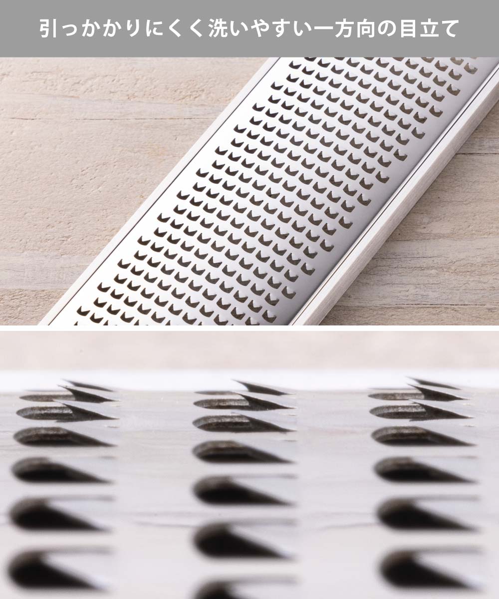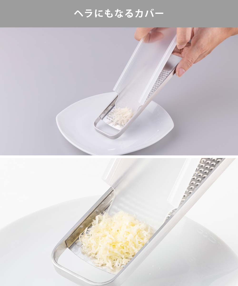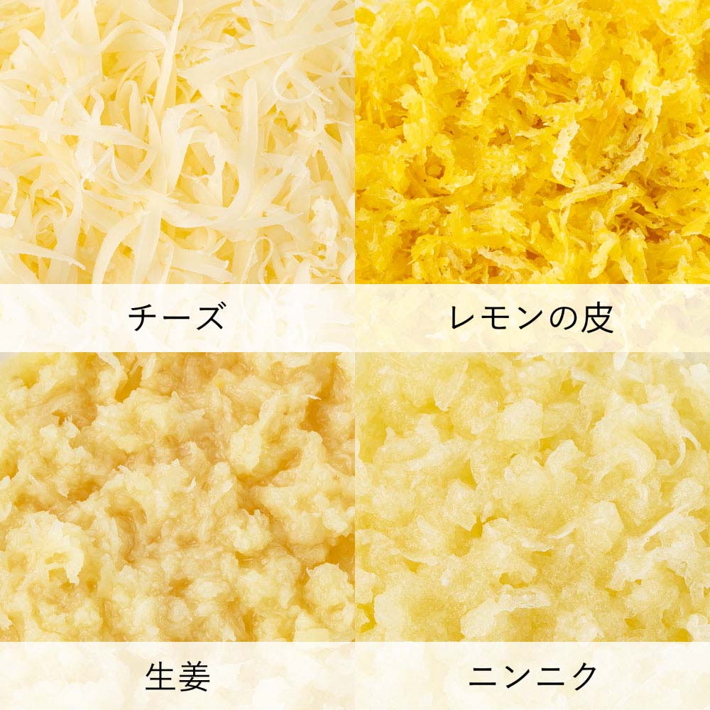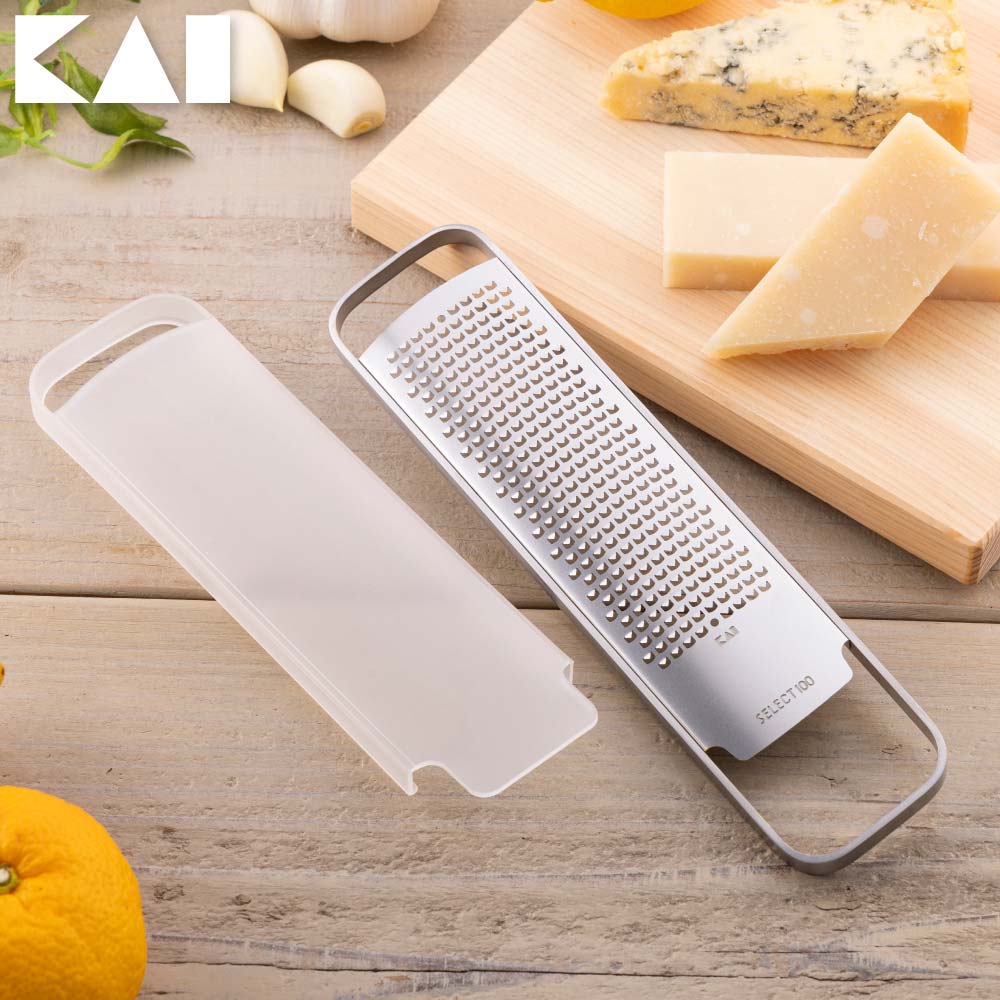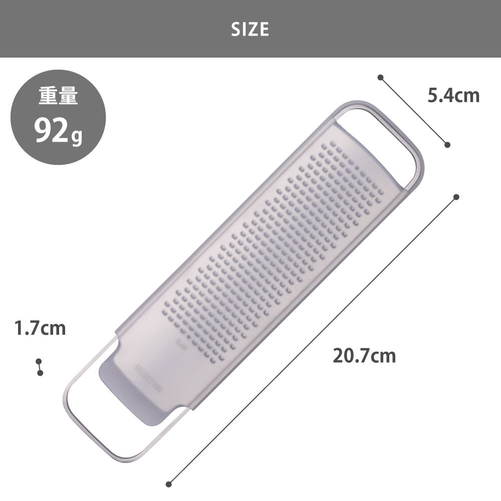 サイズ約207mm×54mm×17mm材質本体(フレーム、刃部):ステンレススチールカバー:ポリプロピレン(耐熱温度110℃)重量約92g製造元貝印ブランドSELECT100生産国中国収納しやすいコンパクト設計なグレーター収納しやすいコンパクトな設計のグレーター。ハードチーズや生姜、柑橘などがおろせます。にんにくは粗目めの仕上がります。カバーは先端がヘラ状になっているので、刃部の裏側に残った食材をこそいでムダなく使う事ができます。スポンジのひっかかりが少なく洗いやすい一方向の目立てです。