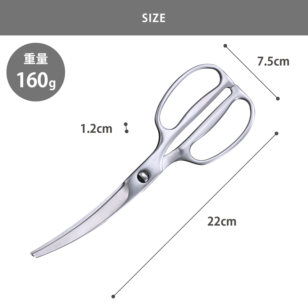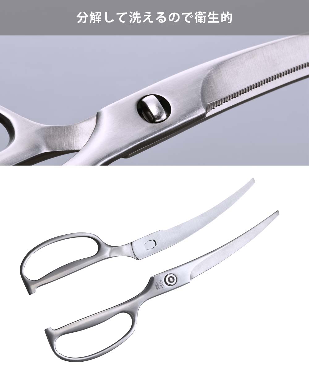 サイズ約22×7.5×1.2cm材質ステンレス刃物鋼重量約160g製造元貝印生産国日本食卓でピザ等の切り分けや包丁では切りにくい肉の脂肪のカットに最適なキッチンバサミ継ぎ目のない一体型で分解して洗えるので衛生的なキッチンバサミ。食材を起こさずとも切りやすいカーブ形状なので、卓上での切り分け時も扱いやすくなっています。切るものが滑りにくい細かな凸凹上の刃(セレーション刃)を採用しました。箱による個装なので、ギフト用にも最適です。食卓でピザ等の切り分けや包丁では切りにくい肉の脂肪のカットに最適です。