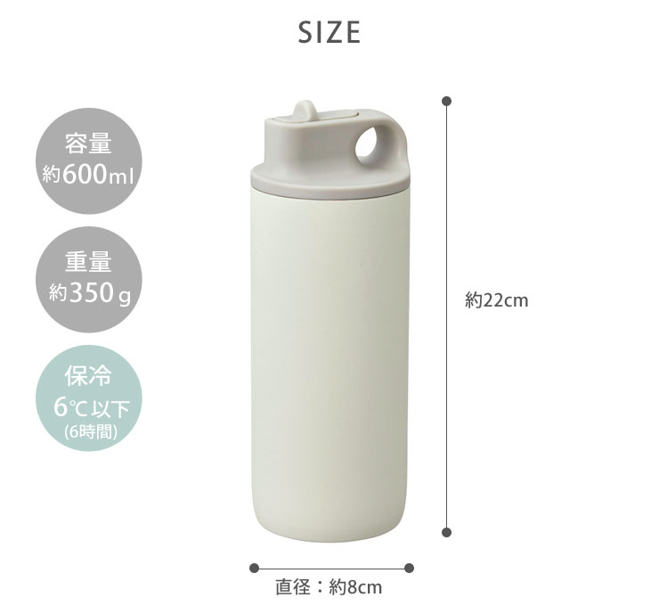 バリエーションホワイト 20281ブラック 20282サンドベージュ 20283アッシュピンク 20284ブルーグレー 20285サイズ本体:φ85×H220mm、蓋なしの高さ:178mm容量600ml重量約350g材質本体:18-8ステンレス鋼 (粉体塗装),熱可塑性エラストマー蓋,飲み口:ポリプロピレン,シリコーンゴム保冷効力6℃以下 (6時間)耐熱温度100度製造元キントー備考●BPAフリー●ドライアイスや炭酸飲料は入れないでください。●食洗機使用不可アクティブなスポーツライフに太陽の下で身体を動かすスポーツライフに向けたACTIVE TUMBLER。動きながらでも開け閉めしやすいスパウトタイプの飲み口は、口当たりが良く快適な飲み心地です。開口部が広いため、氷や飲み物を入れやすく、真空二重構造により長時間冷たさをキープします。底面にはクッション性の高いエラストマー付きで、スタジオの床や地面に置く時の衝撃や音を和らげます。日常使いにも適した600mlと、炎天下での運動やアウトドアユースに適した800mlの2サイズです。飲みやすく快適な飲み口スポーツをしながらでもさっと飲めるよう、動きながらでも開け閉めしやすいスパウトタイプの飲み口は、丸みがあってやさしい口当たりで快適な飲み心地です。蓋の裏側はスムーズな円錐形状で最後まで飲みやすい設計です。安定して持ちやすいデザイン上部に穴があいており、飲むときに指を入れたり、持ち歩くときに指に引っ掛けることが可能で、大き目サイズなのに持ちやすい。外側には傷がつきにくいようパウダーコーティングが施されています。少しざらざらした感触で滑りにくく、安心感があります。優れた保冷効果とクリーンな表面仕上げタンブラー本体は錆びにくいステンレスの二重構造。外びんと内びんの間を真空状態にすることで、保冷6℃以下を6時間保持。氷が溶けにくく、長時間冷たいドリンクを楽しめます。タンブラーの内側に電解研磨を施し、表面を平滑に仕上げているため汚れがつきにくく、お手入れも簡単です。シックで落ち着いたカラースポーティ過ぎないシックな色味で、競技スポーツはもちろん、街中でのサイクリング、ジムでのワークアウトや、アウトドアシーンや公園などでの普段使いも可能。定番のホワイト、クールなブラック、スタイル問わず合わせやすいサンドベージュからお好きな色を選べます。600mlタイプでは、落ち着いた中に個性が光るアッシュピンク、上品な雰囲気のブルーグレーもラインナップ。おしゃれなパッケージでギフトにもぴったり。