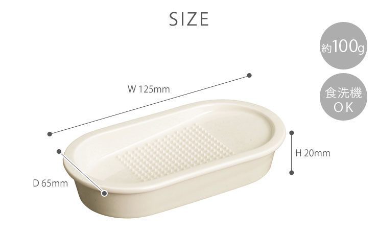 サイズW125 x D65 x H20mm重量約100g材質磁器製造元キントー備考●食洗機使用可●洗浄の際はクレンザーやたわしを使用しないでください。食卓で使うことを考慮したデザインのTAKU道具として使いやすく、食卓に出せばシックな食事シーンを演出するTAKU。味わいある素材を用いており、料理や器との調和を愉しむことができます。コンパクトな生姜おろし上から下に力を加えやすいよう、すりおろしの面に傾斜を付けることで動作をスムーズにしています。手のひらに収まるコンパクトなサイズは軽い力での作業を可能にし、縁をしっかりと抑えられ安定感があります。