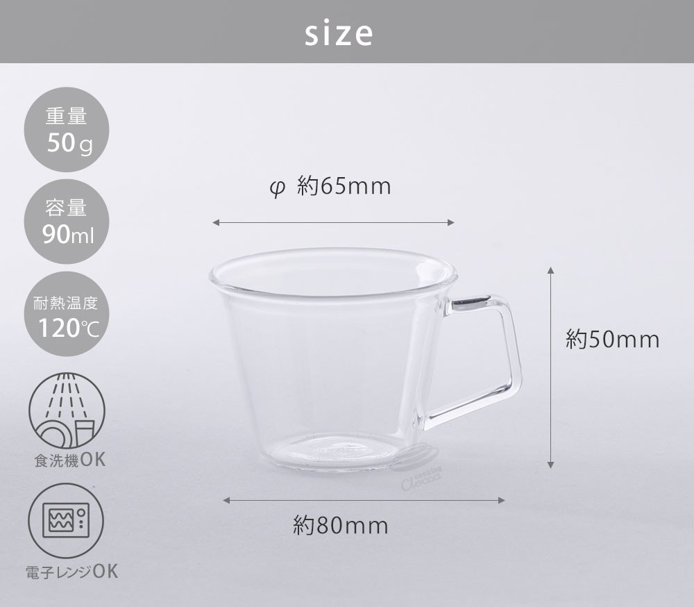 サイズ幅8 × 奥行6.5 × 高さ5cm容量90ml重量約50g材質耐熱ガラス(耐熱温度差 120℃)製造元KINTO生産国中国備考○ 食洗機使用可○ 電子レンジ使用可○ 洗浄の際はクレンザーやたわしを使用しないでください。○ ガラスの急冷は破損の原因となりますので熱いうちに濡れた布で触れたり、濡れた場所に置かないでください。使う人の動作を優美に見せるグラスウェア「妨げないデザイン」をコンセプトとした、シンプルで整然とした美しさをもつCAST。ハンドルの角度とラインは、握ったときの指の位置、カップ本体にかかる重力、持ち上げようとする手の力点、これら3つの要素の微妙なバランスを考慮し、設計されています。それゆえに手の大きさを問わず、持ちやすくなっています。カップの口部は、唇を軽くあてただけでドリンクがすっと口先に注がれるように、わずかに外側に広がっています。機能美を備えた品位ある佇まいがあらゆるシーンに映えます。キャストのドリンクウェアは、エスプレッソ用、紅茶用、コーヒー用、カフェラテ用など、その飲み物をもっともおいしく味わえるように考えられたフォルム。ラインナップが充実しており、幅広いシーンに合わせた展開ができます。