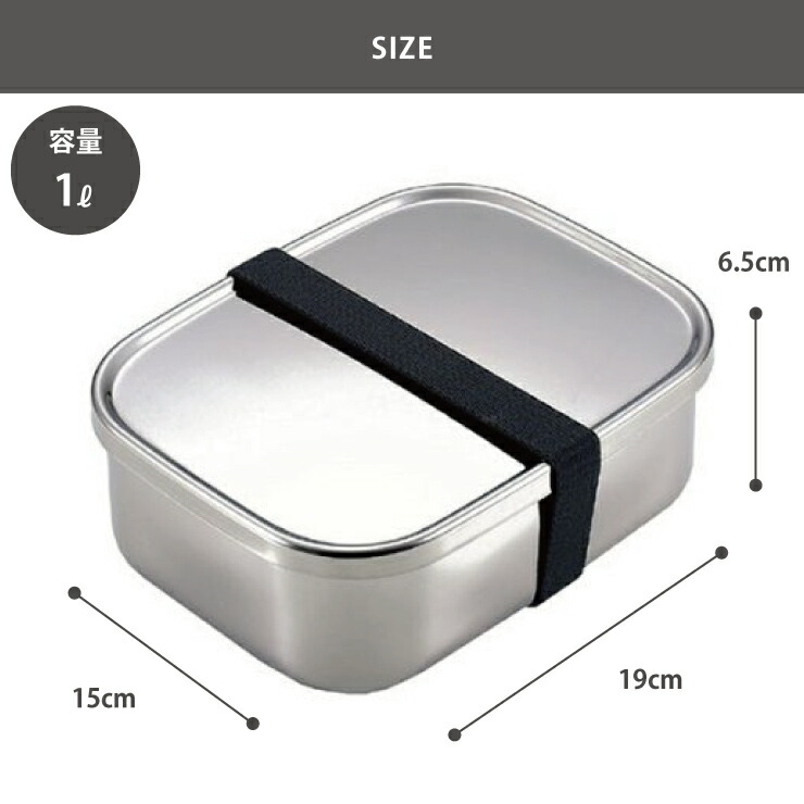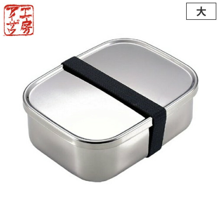 サイズ19.0 × 15.0 × 6.5cm容量1000ml材質本体,蓋:18-8ステンレス、パッキン:シリコン、バンド:ゴム付属品ゴムバンド×1個製造元工房アイザワ生産国日本備考○ 食洗機使用可○ 保温庫使用可○ 電子レンジ使用不可○ 仕切りは付属してません。保存容器としても使えるシンプルで丈夫なステンレスランチボックスシンプルで丈夫なステンレス製ランチボックス。容量1000mlの大きめなお弁当箱。食べ盛りの中高生やたくさん食べたい時におすすめ。四隅が丸いのでおかずがつめやすく、洗いやすい形状です。蓋にはシリコンパッキン付きで、密閉性が高く汁漏れしにくくなっています。付属のゴムバンドでしっかり固定して持ち運びできます。ランチボックスとしてだけでなく、食品の保存容器としてもお使いいただけます。ステンレス製なので、におい移りもしにくく、お手入れも簡単です。食洗機でのお手入れも可。
