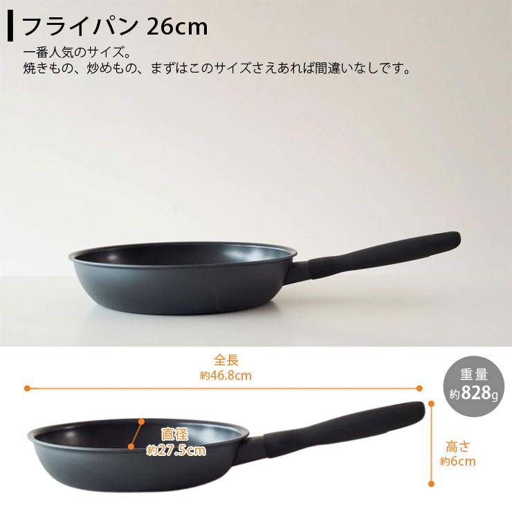 サイズ約全長468 x 奥行275 x 高さ60 mm材質アルミニウム合金 (本体)、ステンレス鋼 (底面)、フェノール樹脂 (ハンドル) + ふっ素樹脂加工 (PFOA フリー)重量約828g対応熱源ガスコンロ、IH調理器(100V/200V)、ハロゲンヒーター、ラジエントヒーター、シーズヒーターブランドMEYER生産国タイまたは中国- Midnight - すべてが黒、の美しさオールブラックが美しく、どんなキッチンにも合うミニマルデザインが目を惹くミッドナイトシリーズ。使いやすい重量や耐久性など、見た目だけではない充実した機能美もこのシリーズの大きな特徴です。●通常のアルミニウムより約8倍硬い、硬質アルマイト加工。●リム周りやリベットにもふっ素樹脂加工を施すことで、食材がこびりつきにくく、お手入れ簡単。●汚れや腐食を防ぎ、電磁調理器 (IH) を含むすべての熱源に対応。●どんな料理でもこなす、調理面積が広く少し深めのデザイン。●縁にかけて柔らかく広がるフレアリムで、スープやソースも注ぎやすく。●握りやすく、熱くなりにくいフェノール樹脂製のハンドルにフックにかけられるハンギングホール。26cmは一番人気のサイズ。焼きもの、炒めもの、まずはこのサイズさえあれば間違いなしです。