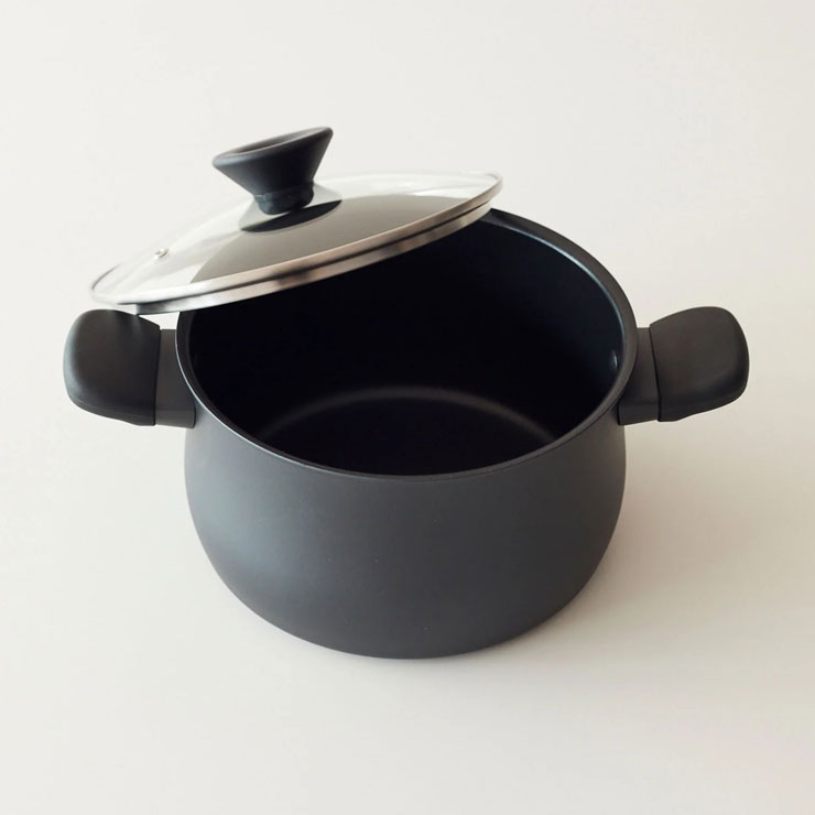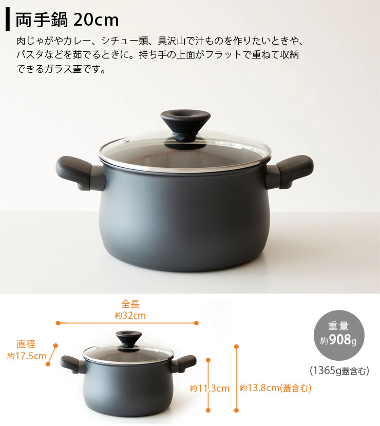 サイズ約全長320 x 奥行175 x 高さ113(蓋含む138)mm材質アルミニウム合金 (本体)、ステンレス鋼 (底面)、フェノール樹脂 (ハンドル) + ふっ素樹脂加工 (PFOA フリー)重量約908g蓋を含む重量約1365g満水容量約4L対応熱源ガスコンロ、IH調理器(100V/200V)、ハロゲンヒーター、ラジエントヒーター、シーズヒーターブランドMEYER生産国タイまたは中国- Midnight - すべてが黒、の美しさオールブラックが美しく、どんなキッチンにも合うミニマルデザインが目を惹くミッドナイトシリーズ。使いやすい重量や耐久性など、見た目だけではない充実した機能美もこのシリーズの大きな特徴です。●通常のアルミニウムより約8倍硬い、硬質アルマイト加工。●リム周りやリベットにもふっ素樹脂加工を施すことで、食材がこびりつきにくく、お手入れ簡単。●汚れや腐食を防ぎ、電磁調理器 (IH) を含むすべての熱源に対応。●どんな料理でもこなす、調理面積が広く少し深めのデザイン。●縁にかけて柔らかく広がるフレアリムで、スープやソースも注ぎやすく。●握りやすく、熱くなりにくいフェノール樹脂製のハンドルにフックにかけられるハンギングホール。●持ち手の上面がフラットで重ねて収納できるガラス蓋。両手鍋20cmは具沢山で汁ものを作りたいときや、パスタなどを茹でるときに使いやすいサイズです。