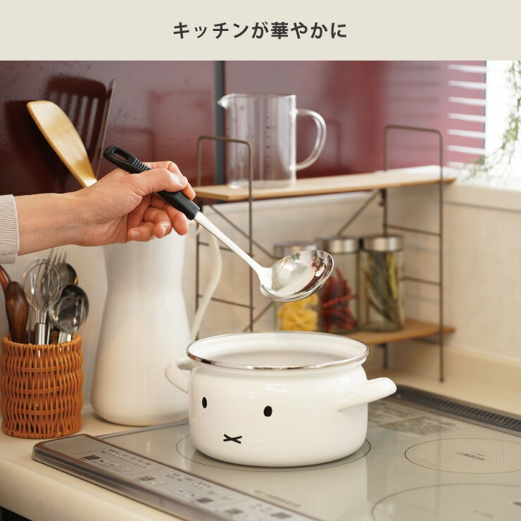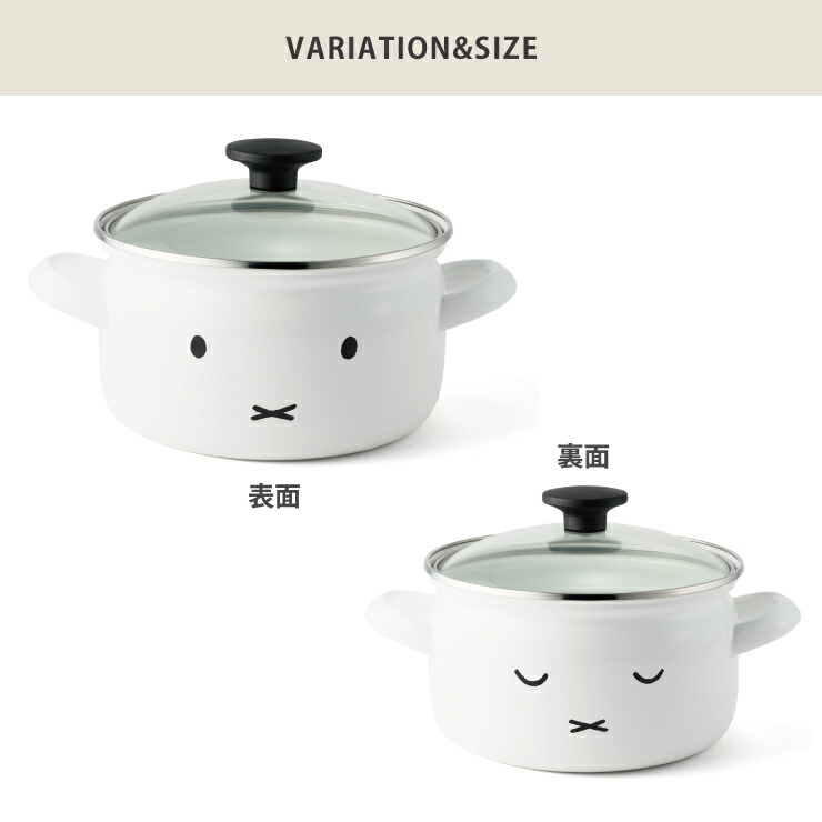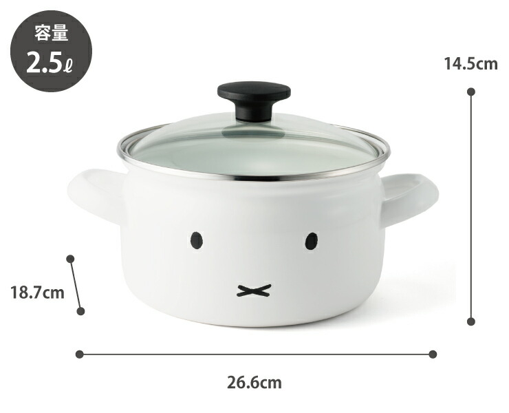 サイズ約W266×D187×H145mm容量約2.5L重量約1.1kg材質本体:ほうろう用鋼板(本体)、強化ガラス(フタ)、樹脂(つまみ・ハンドル)対応熱源ガスコンロ(直火)・IH100V/200V・シーズ・ハロゲン・ラジエント製造元富士ホーローシリーズミッフィー備考●タイ工場製(富士ホーロー 自社工場)●食洗機可、電子レンジ使用不可●日本琺瑯工業会認定S(200V IH)マーク取得ホーローについて●手作業で釉薬を掛けるため、ひとつひとつの表情には多少の個体差が生じます。●ホーローの性質上、焼成時に黒点や色むらの様に見える部位が生じる場合がございます。●鋼板の切り口となる部分は釉薬がかかりにくく、下地の黒いスジが多少見られますが黒い部分もホーロー加工が施されております。※上記の様な場合でも不良ではなくご使用には問題ございませんので安心してお使い下さい。かわいいおかおがデザインされたミッフィーフェイスシリーズミッフィーのおかおだけのシンプルなデザインが人気のミッフィーフェイスシリーズに新たに3商品が追加されました。純白のホーロー製キッチンウェアで、可愛くて清潔感のある両手鍋です。表面がツルツルのガラス質なので雑菌が繁殖しにくく、また金属類の溶出もないので衛生的です。赤ちゃんの離乳食やお年寄りの食事作りにも安心してお使いいただけます。2~3人分のスープや、煮物などにちょうどいい、使いやすいサイズ感。食卓にそのまま出してもかわいいデザインです。表と裏で違う表情ミッフィーのかわいいおかおがデザインされたマルチポット。表と裏で違う表情が楽しめます。 当サイト内の文章・画像等の内容の転載、及び複製等の行為を固く禁じます。