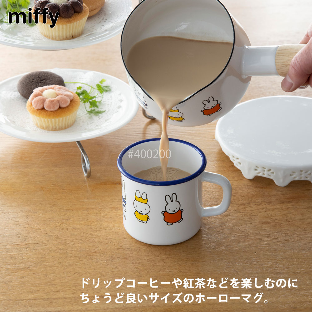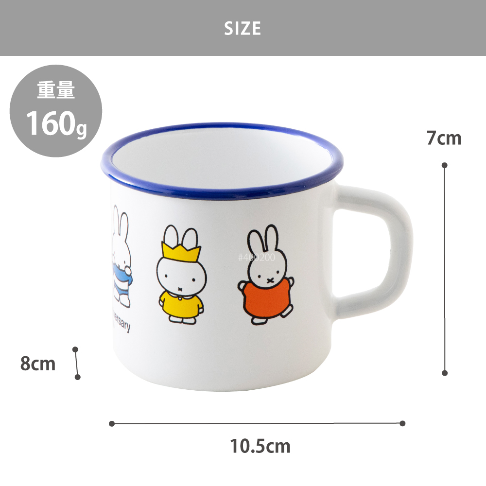 バリエーションミッフィー70周年 MF70-7MGおかお1(ミッフィーフェイス) MFF-7MG.1おかお2(ミッフィーオヤスミ) MFF-7MG.2ボリスフェイス MFB-7MGサイズW 10.5 × D 8.0 × H 7.0cm満水容量270ml重量約130g材質ほうろう用鋼板製造元富士ホーローシリーズミッフィー備考●タイ工場製(富士ホーロー 自社工場)●電子レンジ使用不可●日本琺瑯工業会認定Sマーク取得ホーローについて●手作業で釉薬を掛けるため、ひとつひとつの表情には多少の個体差が生じます。●ホーローの性質上、焼成時に黒点や色むらの様に見える部位が生じる場合がございます。●鋼板の切り口となる部分は釉薬がかかりにくく、下地の黒いスジが多少見られますが黒い部分もホーロー加工が施されております。※上記の様な場合でも不良ではなくご使用には問題ございませんので安心してお使い下さい。毎日清潔に使える ミッフィーのホーロー製マグミッフィーがデザインされたホーローマグ。鋼板の板厚が0.8mmありとても丈夫です。直火での温めもできるのでアウトドアでも使用できます。ドリップコーヒーや紅茶などを楽しむのにちょうど良いサイズです。表面がガラス質で汚れやニオイがつきにくいため清潔で、日常的に使用できます。2025年はミッフィー誕生70周年。ミッフィーの初めての絵本『ナインチェ』は1955年にオランダで出版されました。70周年デザインは、アニバーサリーイヤーを記念して、各年代のミッフィーが並んでいます。ミッフィーフェイスは純白のホーローマグにミッフィーのおかおが転写されています。ミッフィーフェイスとミッフィーのおやすみ顔からお選びいただけます。こぐまのボリスはブラウンのおかお。調理器具や保存容器など豊富なラインアップのミッフィーシリーズ。シリーズで揃えたくなる可愛さです。