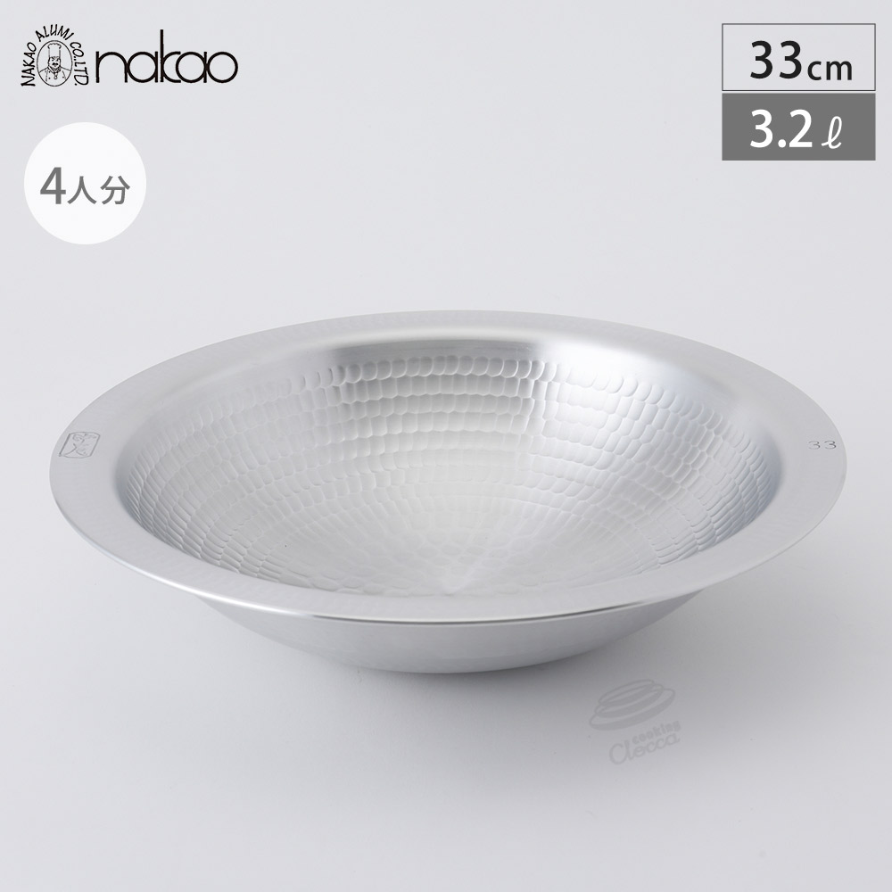 サイズ約外径33.5×深さ7.5cm板厚3.3mm容量約3.2L重量約900g材質アルミ対応熱源ガスコンロ(直火)製造元中尾アルミ製作所生産国日本備考○ IH電磁調理器での使用は出来ません。○ アルミは水や空気にふれると黒っぽく変色する性質がありますが、黒くなっても害はありません。熱伝導が良く、熱ムラが無い極厚アルミ材を使用したうどんすき鍋純度の高い国産アルミ材を使用した、アルミ製の打出うどんすきです。関西の郷土料理として欠かせないうどんすき以外にも、卓上での鍋料理などアイデア次第で様々なご利用が可能です。具材が鍋底に沈みこまないように、浅い底が特徴で、麺を取る際に、汁が飛びづらくなる様に鍋縁が広く水平に設計されております。極厚のアルミ材は熱ムラが無く料理をワンランク上の仕上がりにしてくれます。打出すことによりアルミが圧縮され強度が上がり変形しにくくなります。また、凹凸になることで表面積が広くなり熱が伝わりやすくなります。本格的なプロユースの道具を是非一度お使いください。アルミ製のため、IH電磁調理器での使用は出来ません、ご注意ください。サイズの目安は、24cmは1人分、27cmは2人分、30cmは3人分、33cmは4人分、36cmは5人分の調理に適しています。アルミ製なので軽量で扱いやすく、ハンドルがないので収納しやすい形状です。調理後は鍋全体が熱くなりますので、ふきんやミトンなどで持ち運びしてください。
