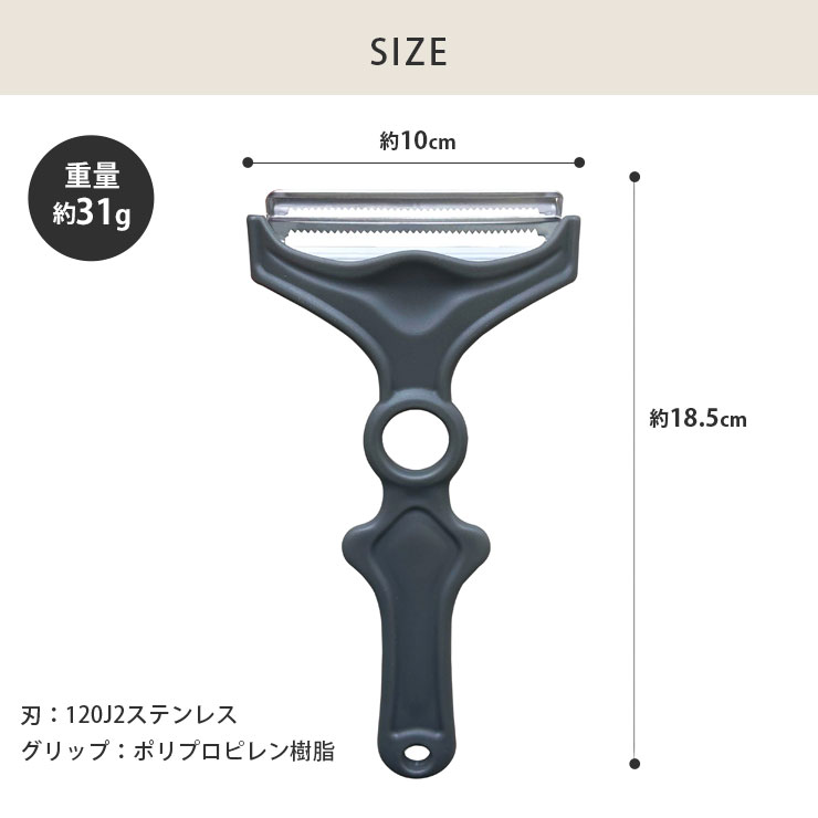 サイズ約18.5×10×3cm重量約31g材質刃:120J2ステンレスグリップ:ポリプロピレン樹脂耐熱温度110度製造元ののじ生産国中国備考○この商品は刃物です。ご使用の際は手を切らないよう、十分ご注意下さい。厚手のゴム手袋の使用を推奨します。ふわふわ感とスピード感を両立させた二枚刃で美味しいふわっふわっ食感の千切りキャベツが出来上がります