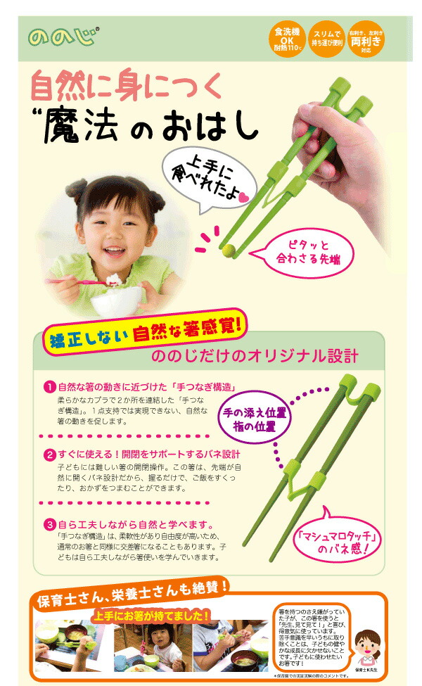 バリエーションSSグリーン/SSレッドSグリーン/SレッドサイズSS:16.3×3.4×1.2cm / 22gS:18.3×3.4×1.2cm / 16g(カプラ装着時)材質箸:SPS樹脂、ハードカプラ,ソフトカプラ:シリコンゴム(耐熱温度 110℃)製造ののじ備考●中国生産●食洗機OK ●ののじ はじめてのちゃんと箸離乳食期を終えてそろそろ箸の使い方を学び始める時期に差し掛かったお子様が、自然に箸の使い方を学んでいくことのできるトレーニング用箸です。補助無しで使えるまで段階的にサポート。箸先が合いやすいサポート力の高いハードサプラ(補助具)でつかむ練習。かためのバネで箸先が安定します。ソフトカプラは自由度があり、自分の力でつかむ感覚を養います。カプラを外せば、普通のお箸として使うことができます。手の大きさに合わせて16cm(SS)、18cm(S)の2サイズをご用意。それぞれグリーンとレッドからお選びいただけます。