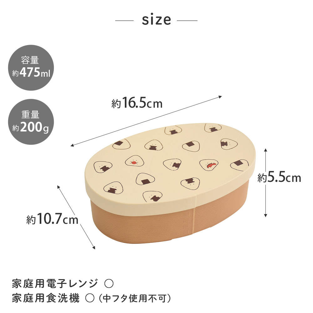 サイズ約W16.5×D10.7×H5.5cm材質本体、蓋:PET、ABS樹脂(ウレタン塗装)中蓋:ポリプロピレン重量約200g満水容量約475ml付属品ランチベルトブランドぎゅっとおにぎりさん製造元逸品社(シュガーランド)生産国日本備考●家庭用電子レンジ使用可能●家庭用食洗機使用可能(中フタを外して)抗菌加工が施されたおにぎりさんのランチボックス抗菌加工が施されたおにぎりさんのランチグッズ。毎日のランチタイムに活躍します。一段タイプの弁当箱は使いやすく、オーバル型なので隅まで洗いやすいです。便利なランチベルト付き。中蓋を外せば電子レンジ、食洗機対応です。