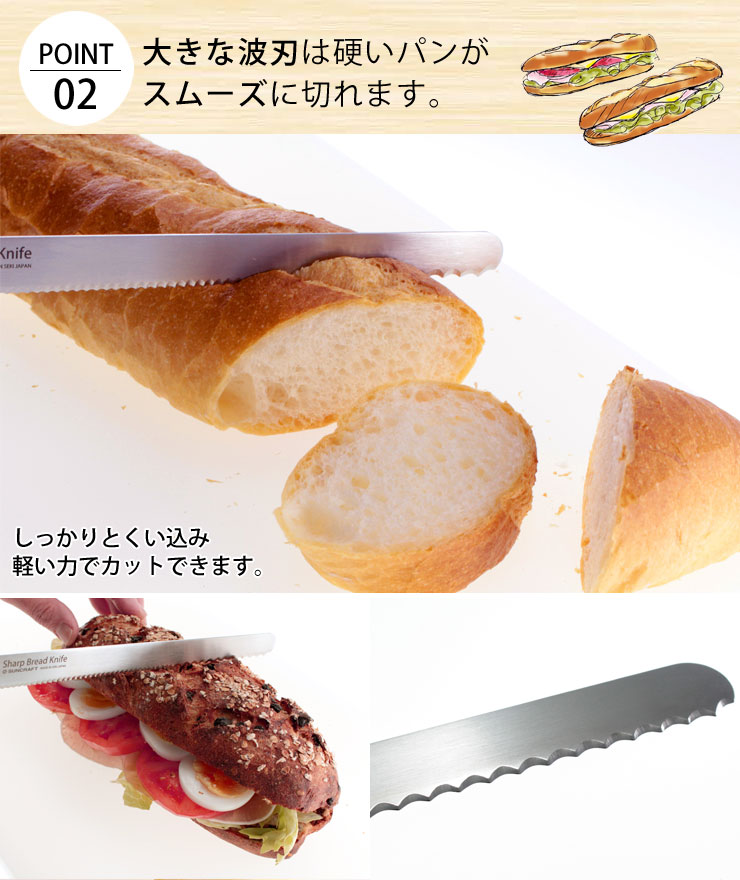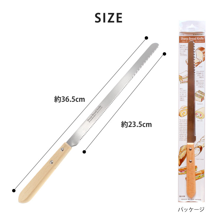 材質刀身:ステンレス刃物鋼、鋲:ステンレス鋼、ハンドル:天然木,ウレタン塗装サイズ本体:約365×23×15mm刃渡り:約235mm重量約80g製造元サンクラフト生産国日本大きな波刃+小さな波刃の組み合わせでふわふわ食パンもハードパンも楽々カット大きな波刃+小さな波刃の組み合わせでふわふわ食パンもハードパンも楽々カットできるブレッドナイフ刃物のまち岐阜県関市で作られた切れ味の良いパン切りナイフです。大きな波刃は硬いパンがスムーズに切れ、小さな波刃はふわふわの焼きたてパンがスパッと切れます。パンくずが出にくく、パンの断面をきれいに仕上げます。手になじみやすく、温かみのある木製ハンドル。