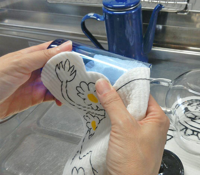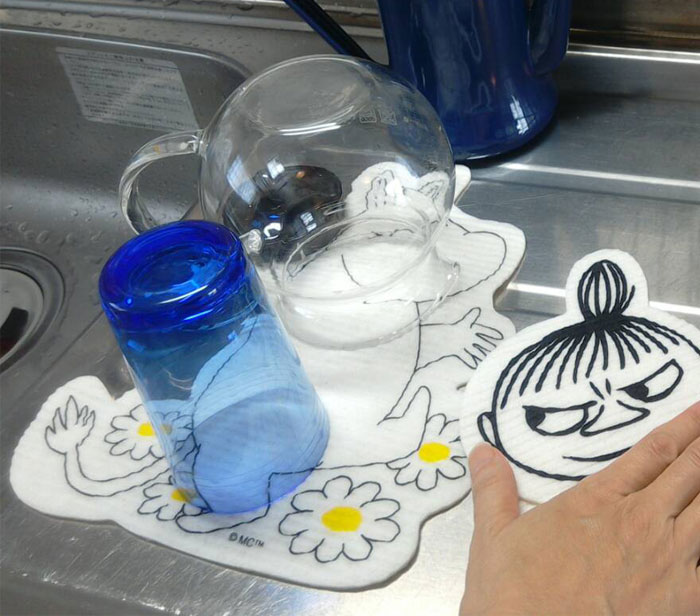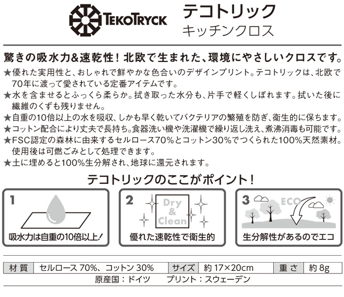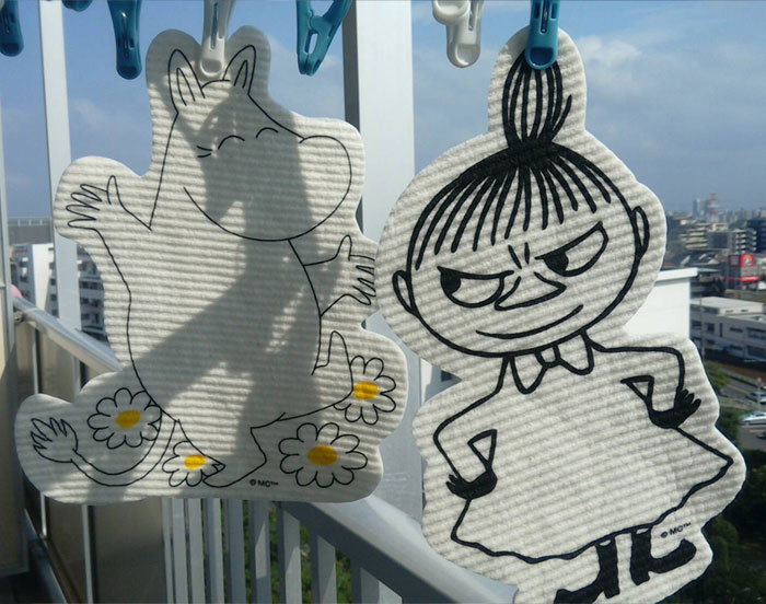 サイズムーミン:W22.6 × D26cmミイ:W16 × D27cm材質セルロース70%、コットン30%商品説明驚きの吸水力&速乾性!北欧で生まれた、環境にやさしいスポンジクロスです。●優れた実用性と、おしゃれで鮮やかな色合いのデザインプリント。テコトリックは、北欧で70年に渡って愛されている定番アイテムです。●水を含ませるとふっくら柔らか。拭き取った水分も、片手で軽くしぼれます。拭いた後に繊維のくずも残りません。●自重の10倍以上の水を吸収、しかも早く乾いてバクテリアの繁殖を防ぎ、衛生的に保ちます。●コットン配合により丈夫で長持ち。食器洗い機や洗濯機で繰り返し洗え、煮沸消毒も可能です。●FSC認定の森林に由来するセルロース70%とコットン30%でつくられた100%天然素材。使用後は可燃ごみとして処理できます。●土に埋めると100%生分解され、地球に還元されます。使い方水で濡らすとやわらかくなるので、ねじらずに軽く絞ってお使いください。ご使用後すぐ汚れを水で洗い流すことにより長くきれいにお使いいただけます。お手入れ方法洗濯機で丸洗いできます。汚れが気になるときは煮沸洗浄してください。洗った後は水気を切って吊るすなどして乾かしてください。※塩素系の漂白剤は漂白力が強く、染料まで脱色するおそれがありますのでご使用にならないでください。ブランドEKOムーミン スポンジクロス ダイカット