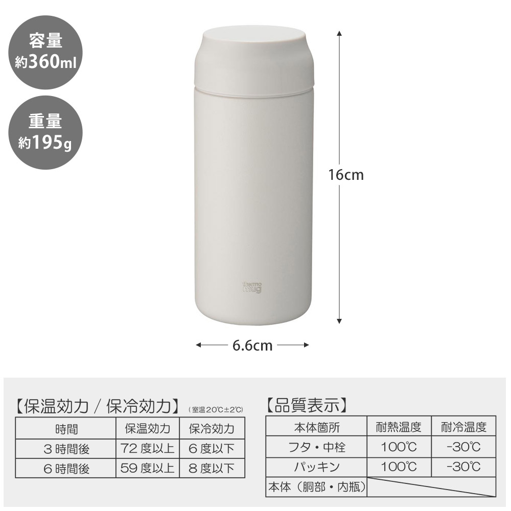 サイズ直径 66×高さ 160mm重量約195g容量360ml材質本体外面:18-8ステンレス本体内側:18-12-Moステンレスフタ・中栓:ポリプロピレンパッキン:シリコーンゴム※真空2重構造保温効力72℃以上(3時間)59℃以上(6時間)保冷効力6℃以下(3時間)8℃以下(6時間)ブランドthermomug備考●中国生産●食器洗浄機、電子レンジ使用不可グレードの高いステンレス SUS316を使用、汚れやにおいがつきにくくお手入れ簡単なステンレスボトル朝から晩まで一日を共にするALLDAY汚れや臭いがつきにくく、容量の割に軽量!更なる使い心地と機能性を進化させたステンレスボトルです。最大の特徴は、最高品質なステンレス素材を採用しており、これによりスポーツドリンク対応も可能で、耐食性が増したことで汚れや臭いがつきにくくお手入れも簡単になりました。さらに真空二重構造で優れた保温保冷効果を発揮するのはもちろん、容量を増やし軽量化も実現しました。使い心地が良くストレスのないものを選んでいただきたい、そんな思いを込めて、朝から晩まで一緒にいたくなるALLDAYが出来上がりました。●基本機能・・・真空二重構造により優れた保温保冷効果を発揮●飲料の種類・・・スポーツドリンク対応●衛生面・・・本体内側ステンレスの凹凸面ををより滑らかで光沢のあるミラーコートを施し、汚れや臭いがつきにくい●飲みやすさ/使いやすさ・・・飲み口は、氷や飲み物が勢いよく出ることを防ぎ、やさしい口当たりで飲みやすさに配慮した構造●重さ・・・従来のthermo mug商品に比べ、大幅な軽量化を実現●容量・・・thermo mugの人気容量から少し増えた0.36LPOINT1「掴む、つまむ、添える」様々な開閉方法を想定した開閉しやすいフタのシルエットです。POINT2高品質SUS316素材を使用した内側は、耐食性に優れスポーツドリンクも入れて持ち運びできます。ニオイがつきにくく、お手入れも簡単に。POINT3傷が付きにくく、手が濡れても滑りにくいパウダーコーティング塗装を本体外装に施しました。