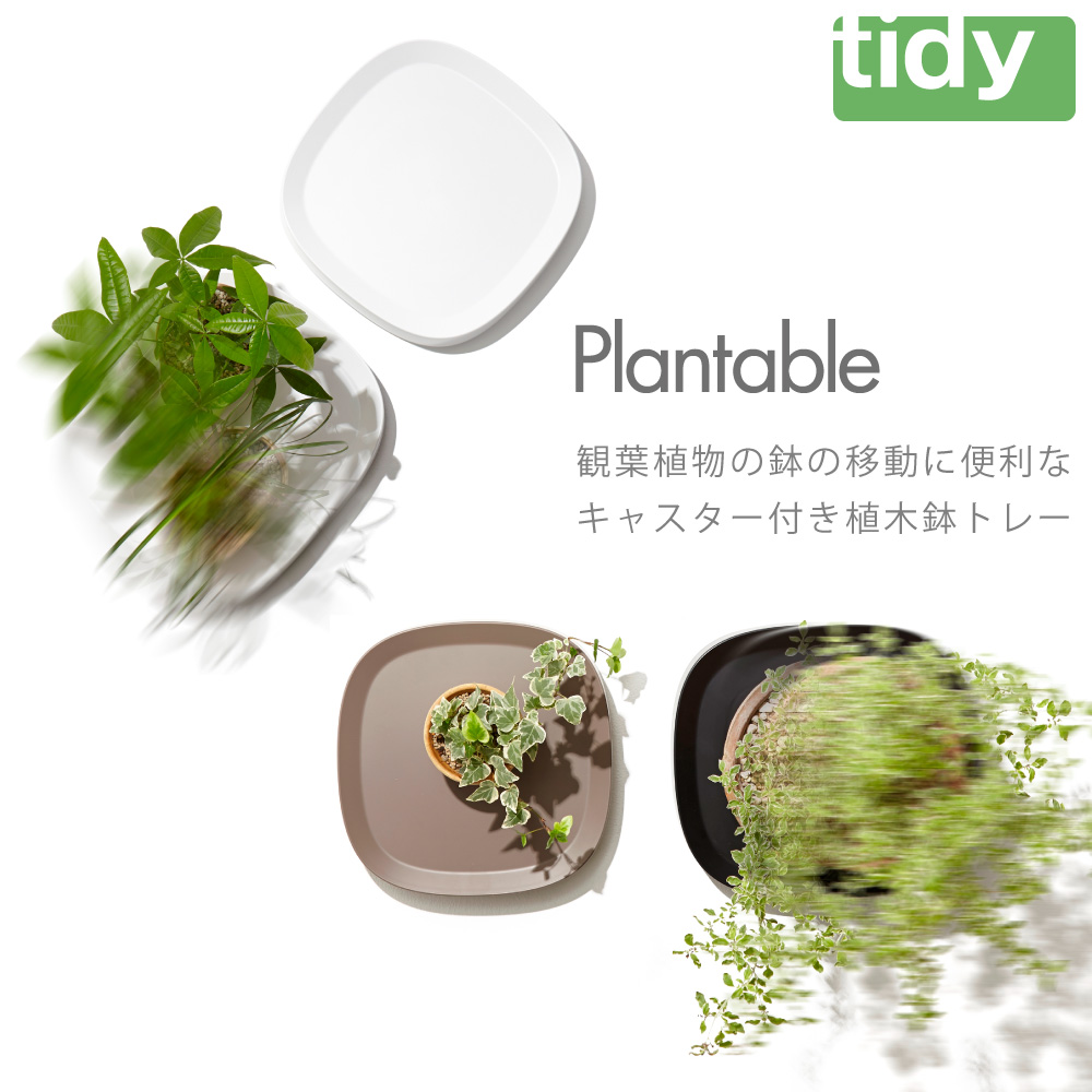 サイズ約W32×D32×H5.7cm対応サイズ有効内寸 26×26cm円形鉢:最大底面の直径26cm(10号鉢目安)まで角型鉢:最大底面の一辺が21cmまで重量約670g耐荷重40Kg材質本体:AES樹脂、キャスター:スチール,ウレタン製造元tidy生産国日本観葉植物の鉢の移動に便利なキャスター付き植木鉢トレープランタブルは、観葉植物の鉢の移動に便利なキャスター付き植木鉢トレーです。キャスターが目立たないスッキリとしたデザインは、屋内のどんな空間にもフィットするので、インテリアグリーンのレイアウトの幅を広げます。円形鉢の場合/最大底面の直径26cm(10号鉢目安)まで、角型鉢の場合/最大底面の一辺が21cmまでの鉢を載せることができます。○ ふちの立ち上がりが、こぼれた水を受け止めます。○ 底面のキャスターで、前後左右自由に移動できます。