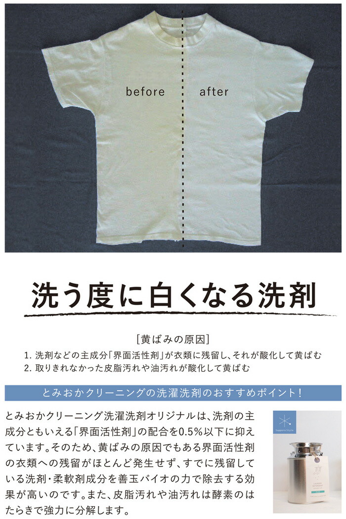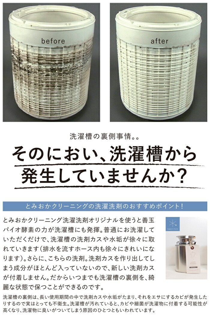 正味量800g用途綿・麻・合成繊維用液性弱アルカリ性成分アルカリ剤(炭酸塩)、水軟化剤、分散剤、再汚染防止剤(カルボキシメチルセルロース)、漂白剤(酸素系)、酵素、善玉バイオ、植物性脂肪酸商品説明善玉バイオのEM菌が汚れと臭いを抑え、洗濯中に発生しがちな他の衣類の汚れが付着しない、再汚染防止効果の高い洗剤です。ブランドとみおかクリーニング備考【詰め替え用】※ミルク缶・計量スプーン無し ●オリジナル洗濯洗剤 詰替こちらの商品は詰め替え用のページです。善玉バイオでやさしくきれいに善玉バイオのEM菌が汚れと臭いを抑え、洗濯中に発生しがちな他の衣類の汚れが付着しない再汚染防止効果の高い洗剤です。黄ばんだTシャツも洗うたびに白くなる!とみおかクリーニング洗濯洗剤界面活性剤を極力抑え、泡立ちが少ないのですすぎ1回で澄む環境にも優しいエコ洗剤です。洗うたびに元々衣類に付着していた洗剤などの残留物が除去され、繊維本来の柔らかさを引き出します。(柔軟剤を使用しなくても柔らかく仕上がります)普段のお洗濯をしながら洗濯槽もきれいにしてくれるので、3か月程毎日使うと洗濯槽の裏側もピカピカ。洗濯機までキレイになります。使用方法:洗濯機に入れた衣類の上から目安量を直接振りかけて使用します。ドラム式洗濯機もOKです。ドラム式洗濯機の場合も、目安量を直接衣類に振り掛けてご使用下さい。見た目だけじゃなく、洗浄力にこだわったオリジナル洗剤クリーニング工場でも使用しているとみおかクリーニングオリジナル洗濯洗剤は、ミルク缶に入っているというかわいい見た目もさることながら、その洗浄力もたいへん優秀です。洗濯洗剤は液体洗剤よりも粉洗剤の方がよく落ちます。ですが、従来の粉洗剤は溶け残りが発生して一度ぬるま湯に溶かしてから使用しなければ心配ですし面倒というデメリットがありました。とみおかクリーニングオリジナル洗剤は、洗浄力の高い粉洗剤にこだわりつつ、溶け残りの心配にも着目しました。縦型洗濯機、ドラム式洗濯機、どちらでも「直接、洗濯ものに振り掛けて」ご使用いただけます。(事前に溶かす必要はありません)※洗濯機に付属している「洗剤投入口」には入れないでください。直接まんべんなく洗濯物に振りかけて下さい※表示分量以上にご使用されますと溶け残りが発生する場合がございます。界面活性剤0.5%、そして善玉バイオの力を発揮泡立ち少なく すすぎは1回 使用量も今までと同じ時間や家計に嬉しいすすぎは1回でOK。使用量も少なくて済むので忙しい家事仕事の負担を軽減します。また、柔軟剤を使用しなくてもふんわり柔らかく仕上がりますので、柔軟剤による肌荒れにお悩みの方にもおすすめです。洗うたびに吸水性があがりますので、柔軟剤を使用される方も柔軟剤の量を半分に減らすことができます。お洗濯前にご確認ください●この洗浄剤は泡立ちません。●この洗浄剤は従来に比べて少量できれいに洗えます。適量にてご使用ください。●洗浄剤投入の際、洗浄剤が一ヶ所にかたよらないように注水のタイミングを上手にご利用ください。●色落ちの心配な衣類は、洗浄剤を濃い目に溶き、衣類の目立たない部分につけてしばらく置き、異常のある場合は使用しないでください。【使用上の注意】●使用時は容器のフタを閉じ、お子様の手の届かない場所に保管してください。荒れ性の方や洗浄剤をブラシにつけて洗う時はゴム手袋などを着用ください。●用途以外には使用しないでください。【応急処置]●目に入った時はこすらずに真水で洗い流してください。●飲み込んだ時は、口をすすぎ、水を飲むなどの処置をしてください。