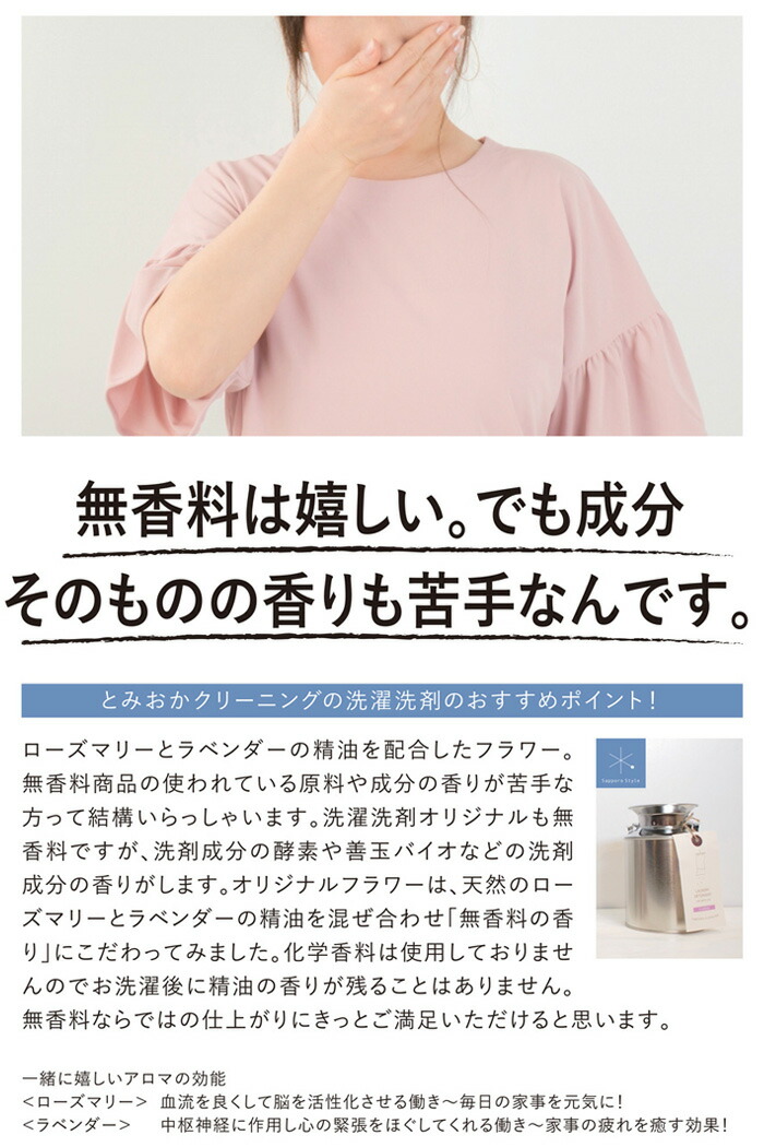 正味量800g用途綿・麻・合成繊維用液性弱アルカリ性成分アルカリ剤(炭酸塩)・水軟化剤・分散剤・漂白剤・再汚染防止剤(カルボキシメチルセルロース)・酵素・善玉バイオ(特殊酵素)・天然脂肪酸・天然香料商品説明オリジナルにラベンダーとローズマリーの天然香料を配合しました。優しい香りで毎日のお洗濯に癒しのリラックス効果を与えてくれます。ブランドとみおかクリーニング備考【詰め替え用】※ミルク缶・計量スプーン無し ●オリジナル洗濯洗剤フラワー 詰替こちらの商品は詰め替え用のページです。天然香料配合とみおかクリーニング オリジナル洗濯洗剤に天然香料を配合しました。今回は、ラベンダーとローズマリーのエッセンシャルオイルの配合です。強い香料成分ではありませんので、残香はほとんどありません。蓋を開けた時のほのかな香りをぜひお楽しみください。※天然香料のため、空気に長く触れると香りの効果が薄くなりますので、蓋の閉まる容器にお入れくださいラベンダー&ローズマリー配合 その効果は~リラックス効果が高いと言われるラベンダーに少しだけローズマリーを配合しています。そのため、より沈静作用が高いのが特徴です。蓋を開けた時に思わず深呼吸したくなるその香りでリラックスできることは間違いないでしょう。朝から忙しくてバタバタしている毎日に少しでもリラックスできる時間をお届けしたいと開発しました。香りの持続は期待できません強い香料は使用しておりません。そのためお洗濯後の香りの持続効果は期待できません。そのため今回はこちらのフラワーは限定販売とさせて頂きます。これからもより皆様のご期待に添えるよう環境にやさしく人にも優しい洗剤を開発してまいりますので、どうぞ楽しみにしていてください。泡立ち少なく すすぎは1回 使用量も今までと同じ時間や家計に嬉しいすすぎは1回でOK。使用量も少なくて済むので忙しい家事仕事の負担を軽減します。また、柔軟剤を使用しなくてもふんわり柔らかく仕上がりますので、柔軟剤による肌荒れにお悩みの方にもおすすめです。洗うたびに吸水性があがりますので、柔軟剤を使用される方も柔軟剤の量を半分に減らすことができます。お洗濯前にご確認ください●この洗浄剤は泡立ちません。●この洗浄剤は従来に比べて少量できれいに洗えます。適量にてご使用ください。●洗浄剤投入の際、洗浄剤が一ヶ所にかたよらないように注水のタイミングを上手にご利用ください。●色落ちの心配な衣類は、洗浄剤を濃い目に溶き、衣類の目立たない部分につけてしばらく置き、異常のある場合は使用しないでください。【使用上の注意】●使用時は容器のフタを閉じ、お子様の手の届かない場所に保管してください。荒れ性の方や洗浄剤をブラシにつけて洗う時はゴム手袋などを着用ください。●用途以外には使用しないでください。【応急処置]●目に入った時はこすらずに真水で洗い流してください。●飲み込んだ時は、口をすすぎ、水を飲むなどの処置をしてください。
