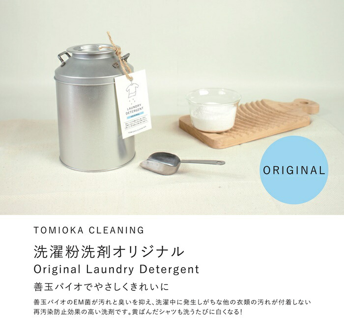 正味量本体:800g詰め替え:800g用途綿・麻・合成繊維用液性弱アルカリ性成分アルカリ剤(炭酸塩)、水軟化剤、分散剤、再汚染防止剤(カルボキシメチルセルロース)、漂白剤(酸素系)、酵素、善玉バイオ、植物性脂肪酸商品説明善玉バイオのEM菌が汚れと臭いを抑え、洗濯中に発生しがちな他の衣類の汚れが付着しない、再汚染防止効果の高い洗剤です。ブランドとみおかクリーニング備考本体と詰め替えのセット品ステンレス計量スプーン付き ●オリジナル洗濯洗剤 ミルク缶 オリジナル&詰め替えセットTOMIOKA CLEANING洗濯粉洗剤ミルク缶オリジナル 800g & 詰め替え 800g善玉バイオでやさしくきれいに善玉バイオのEM菌が汚れと臭いを抑え、洗濯中に発生しがちな他の衣類の汚れが付着しない再汚染防止効果の高い洗剤です。黄ばんだTシャツも洗うたびに白くなる!とみおかクリーニング洗濯洗剤界面活性剤を極力抑え、泡立ちが少ないのですすぎ1回で澄む環境にも優しいエコ洗剤です。洗うたびに元々衣類に付着していた洗剤などの残留物が除去され、繊維本来の柔らかさを引き出します。(柔軟剤を使用しなくても柔らかく仕上がります)普段のお洗濯をしながら洗濯槽もきれいにしてくれるので、3か月程毎日使うと洗濯槽の裏側もピカピカ。洗濯機までキレイになります。使用方法:洗濯機に入れた衣類の上から目安量を直接振りかけて使用します。ドラム式洗濯機もOKです。ドラム式洗濯機の場合も、目安量を直接衣類に振り掛けてご使用下さい。見た目だけじゃなく、洗浄力にこだわったオリジナル洗剤クリーニング工場でも使用しているとみおかクリーニングオリジナル洗濯洗剤は、ミルク缶に入っているというかわいい見た目もさることながら、その洗浄力もたいへん優秀です。洗濯洗剤は液体洗剤よりも粉洗剤の方がよく落ちます。ですが、従来の粉洗剤は溶け残りが発生して一度ぬるま湯に溶かしてから使用しなければ心配ですし面倒というデメリットがありました。とみおかクリーニングオリジナル洗剤は、洗浄力の高い粉洗剤にこだわりつつ、溶け残りの心配にも着目しました。縦型洗濯機、ドラム式洗濯機、どちらでも「直接、洗濯ものに振り掛けて」ご使用いただけます。(事前に溶かす必要はありません)※洗濯機に付属している「洗剤投入口」には入れないでください。直接まんべんなく洗濯物に振りかけて下さい※表示分量以上にご使用されますと溶け残りが発生する場合がございます。界面活性剤0.5%、そして善玉バイオの力を発揮泡立ち少なく すすぎは1回 使用量も今までと同じ時間や家計に嬉しいすすぎは1回でOK。使用量も少なくて済むので忙しい家事仕事の負担を軽減します。また、柔軟剤を使用しなくてもふんわり柔らかく仕上がりますので、柔軟剤による肌荒れにお悩みの方にもおすすめです。洗うたびに吸水性があがりますので、柔軟剤を使用される方も柔軟剤の量を半分に減らすことができます。お洗濯前にご確認ください●この洗浄剤は泡立ちません。●この洗浄剤は従来に比べて少量できれいに洗えます。適量にてご使用ください。●洗浄剤投入の際、洗浄剤が一ヶ所にかたよらないように注水のタイミングを上手にご利用ください。●色落ちの心配な衣類は、洗浄剤を濃い目に溶き、衣類の目立たない部分につけてしばらく置き、異常のある場合は使用しないでください。【使用上の注意】●使用時は容器のフタを閉じ、お子様の手の届かない場所に保管してください。荒れ性の方や洗浄剤をブラシにつけて洗う時はゴム手袋などを着用ください。●用途以外には使用しないでください。【応急処置]●目に入った時はこすらずに真水で洗い流してください。●飲み込んだ時は、口をすすぎ、水を飲むなどの処置をしてください。