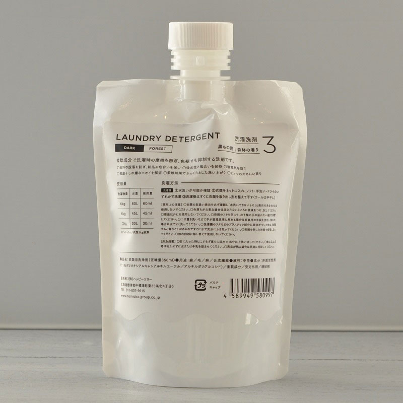 フレグランスヒノキベースの森林の香り正味量350ml用途綿、毛、麻、合成繊維用液性中性成分界面活性剤(11%ポリオキシアルキレンアルキルエーテル、アルキルポリグルコシド)、柔軟成分、安定化剤、増粘剤使用方法洗浄前にまず洗濯表示の水洗い可能であることを確認。1.衣類をネットに入れ、ソフト・手洗い・ドライのいずれかで洗濯2.洗濯後はすぐに衣類を取り出し形を整えて干す(ウールは平干し)使用量:水30Lに40mlブランドとみおかクリーニング備考●日本製●ポンプは別売り ●DARK 色あせ防止用洗剤TOMIOKA CLEANING衣類の染料(色素)の脱落を防ぎ、新品時の色合いを保持柔軟成分で洗濯時の摩擦を防ぎ、色あせを抑制する洗剤。お気に入りの黒いシャツ、濃い色デニム。気に入っているからこそ何度も着用するし、何度も洗濯します。そして気付けば色が褪せてしまい…残念な気持ちになった経験があるかと思います。でもこれからは大丈夫。柔軟成分が洗濯時の衣類の摩擦を防ぎ、色落ち・色あせを抑制してくれます。比べて使ってみてください。効果が実感できますよ。フレグランスはヒノキベースの森林の香りヒノキの精油作用で部屋干しの嫌な臭い解消。優しい森林の香りが洗い上りも香ります。〇染料の脱落を防ぎ、新品の色合いを保つ 〇撥水性と風合いを保持 〇静電気を防ぐ 〇部屋干しの嫌なニオイを解消 〇柔軟効果でふっくらとした洗いあがり 〇ヒノキのやさしい香り使用方法洗浄前にまず洗濯表示の水洗い可能であることを確認。1.衣類をネットに入れ、ソフト・手洗い・ドライのいずれかで洗濯2.洗濯後はすぐに衣類を取り出し形を整えて干す(ウールは平干し)使用量:水30Lに40ml