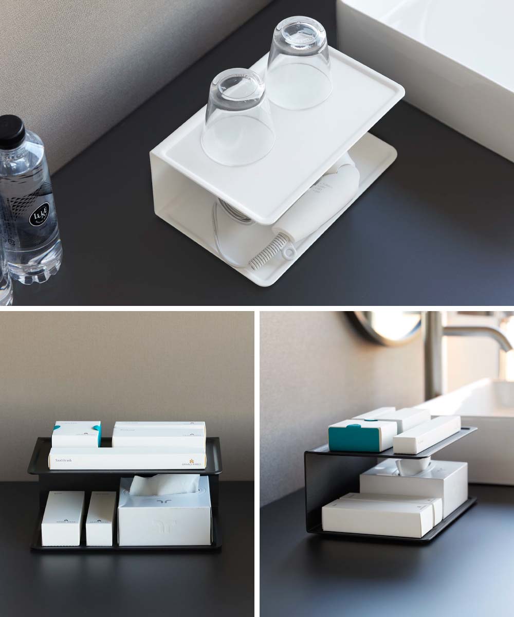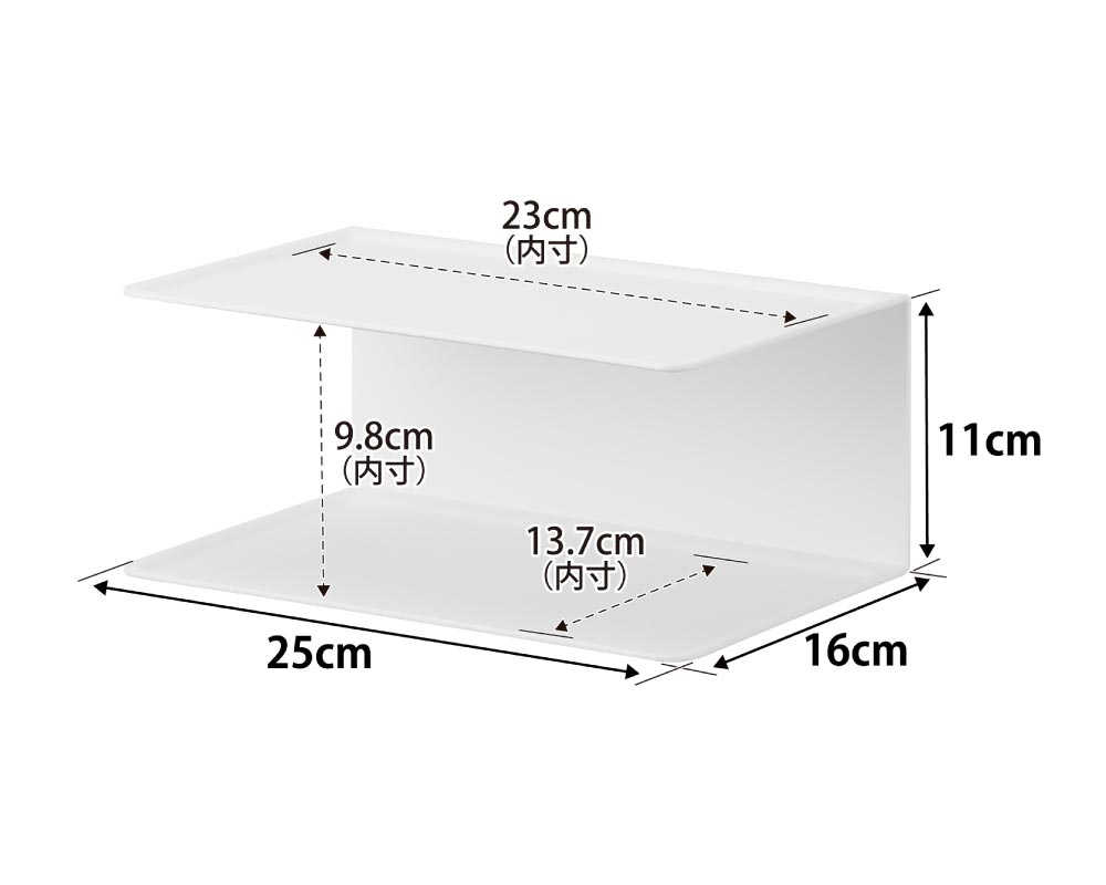 材質本体:スチール(ユニクロメッキ+粉体塗装)滑り止め:シリコーンゴムサイズ各段トレー部:約W23×D13.7×H11cm内寸サイズ約W25×D16×H11cm(下段:H9.8)cm重量約1650g耐荷重1kg(静止荷重)製造元山崎実業ブランドtower備考中国丈夫なスチール製のアメニティー収納ドライヤーなどのアメニティー収納にぴったり。上段、下段ともトレー形状になっているので、小物が置きやすく、すっきりまとめることができます。丈夫なスチール製。