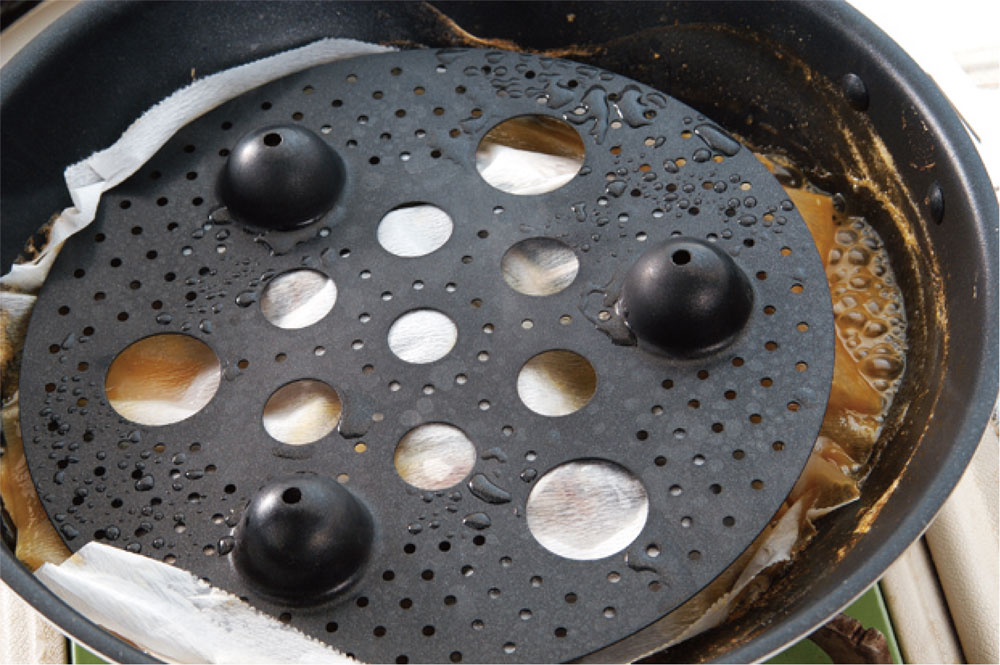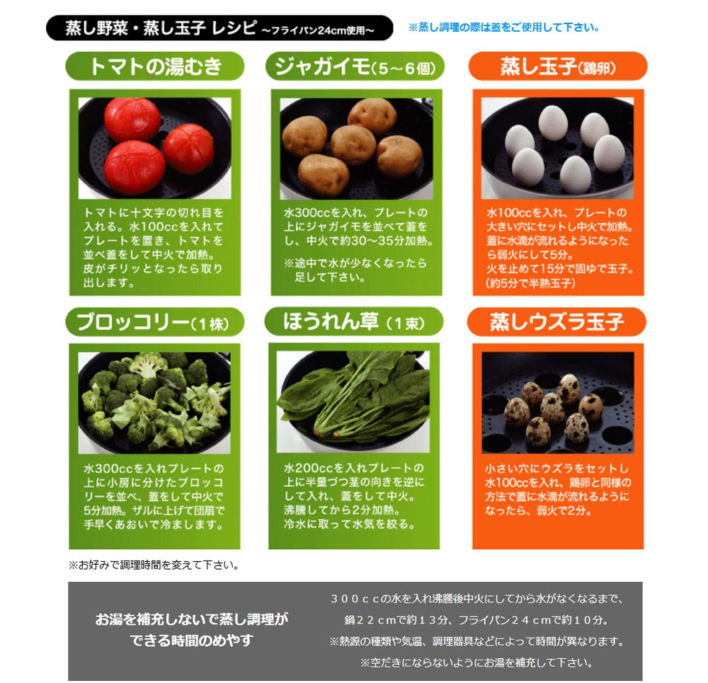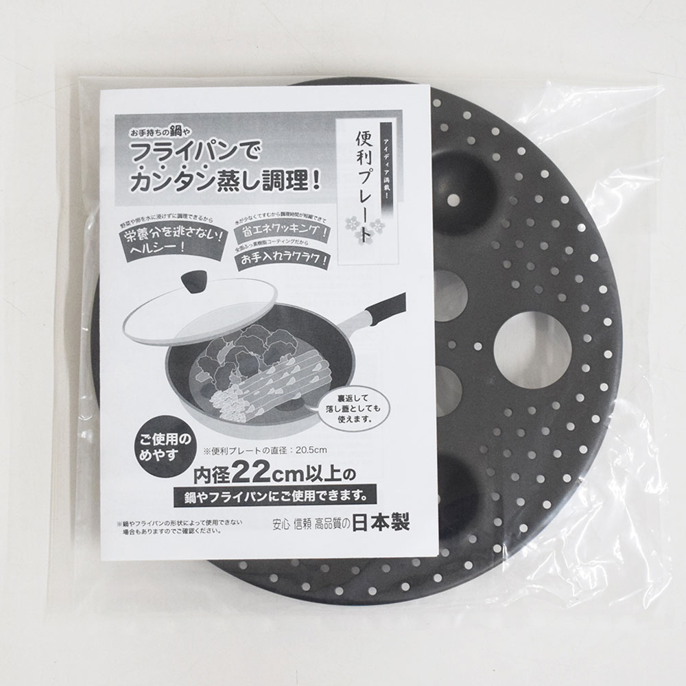 サイズ直径20.5×高さ2.0cm重量約170g材質本体:ステンレス鋼(板厚0.7mm)表面:ふっ素樹脂塗膜加工対応サイズ内径22cm以上の鍋やフライパンでご使用いただけます。製造元ウルシヤマ金属工業生産国日本お手持ちの鍋やフライパンで簡単蒸し料理「便利プレート」は、様々な機能を持つスチームプレートです。蒸し料理はもちろん、落し蓋、パスタメジャーなどにも使えます。野菜は茹でるより蒸したほうが、栄養や旨みが逃げず、しかも、少量の水で蒸せるからとても経済的です。しかも、全面ふっ素樹脂加工なので、お手入れ簡単です。お湯を補充しないで蒸し調理ができる時間のめやす300ccの水を入れ沸騰後、中火にしてから水がなくなるまで、鍋22cmで約13分、フライパン24cmで約10分。※蒸し調理の際は蓋をご使用して下さい。※熱源の種類や気温、調理器具などによって時間が異なります。※空だきにならないようにお湯を補充して下さい。数量限定。簡易パッケージのお買い得品です。ウルシヤマ金属工業株式会社の製品は、本体の成形から塗装、研磨、組み立て・梱包に至るまで全て自社内で一貫生産しています。