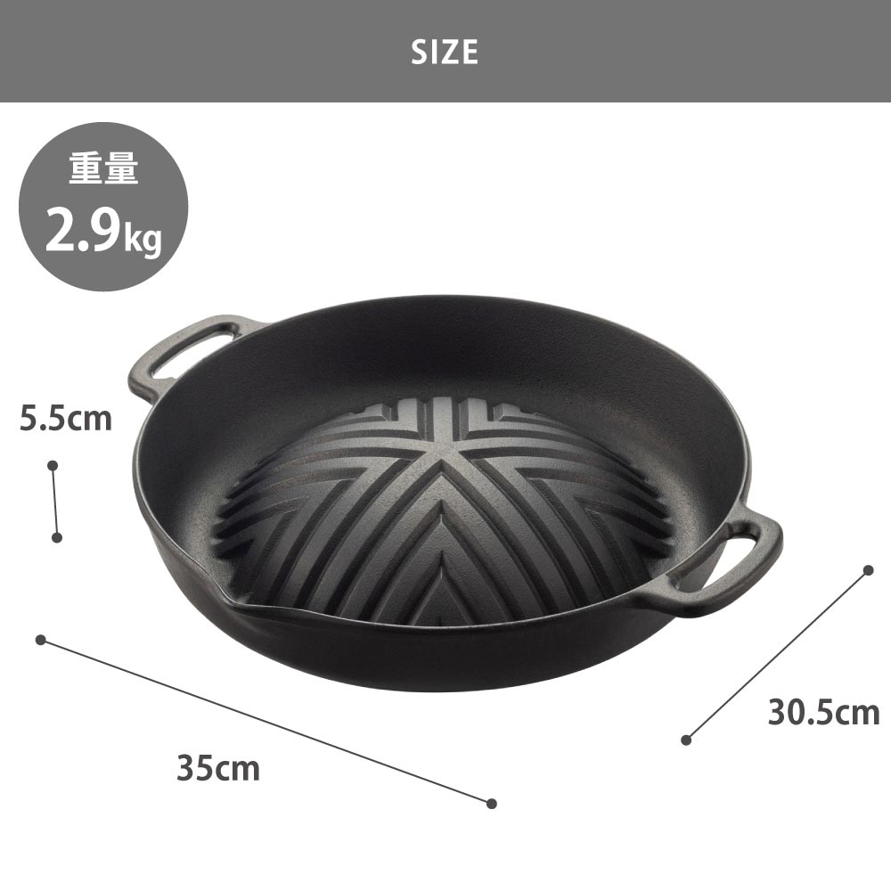 サイズ約W35×D30.5×H5.5cm内径:約28.5cm、深さ:5cm重量約2.9kg材質鋳鉄(シリコン焼付塗装)対応熱源ガスコンロ(直火)製造元岩鋳生産国日本備考○電子レンジ・食器洗浄器、乾燥機・IH調理器でのご使用はできません。おうちで本格的なジンギスカンが楽しめるワンランク上の美味しさを楽しめるジンギスカン専用鍋。カセットコンロや炭火でジンギスカンを楽しむことができます。厚みのある南部鉄器は蓄熱性が良く、温度を一定に保つことができるので食材の旨みや栄養を逃さずに焼き上げてくれます。お肉の余分な脂を落としてくれます。野菜も香ばしく焼けます。ジンギスカンだけでなく、焼肉も楽しめます。南部鉄でできた調理鍋は、使うだけで鉄分を効率よく補うことができます。また鉄製の鍋は蓄熱性が高く、使い込むほど馴染むのが特徴。一生物の逸品です。