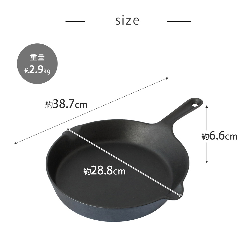 サイズ約W28.8×D38.7×H6.6cm重量約2.9kg材質鋳鉄(天然漆の焼付塗装)対応熱源ガスコンロ(直火)、IH、ハロゲンヒーターメーカー菊地保寿堂生産国日本蓄熱性が高い、鉄鋳物のフライパン熱伝導率が良く、均等に仕上がります。鋳物は輻射熱による遠赤外線効果が高いため、食材の芯まで熱が入ります。