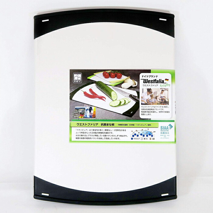 材質本体:ポリプロピレン、滑り止め部:熱可塑性エラストマー無機系抗菌剤 イオンピュア(日本製)配合耐熱温度まな板部:120度、すべり止め部:100度サイズ幅 28×奥行 20×高さ 1cm重量約425gブランドWestfalia販売元富士ホーロー備考●生産国 タイ●家庭用食洗機使用可●Westfalia(ウエストファリア) 抗菌まな板 S無機系抗菌剤「イオンピュア」配合のまな板。イオンピュアは安全性が高く(発揮性なし)、耐熱性があるという特長をもった日本製の無機系抗菌剤です。水分に触れるとプラスに帯電している銀イオンが少しずつ放出され、細菌の表面の電気的バランスを崩して死滅させます。日本のSIAA(一般社団法人抗菌製品技術協議会)の基準に沿った抗菌性能です。両端には滑り止めがついているため、調理中にまな板が動きにくく使いやすい。また、刃あたりも良く、包丁の刃に優しいまな板です。もちろん、日本の品質基準、食品安全基準をクリアしているので、安心してお使いいただけます。食洗機でも使えるので、お手入れも簡単です。お手入れ後は良く乾かしてからの収納をおすすめします。