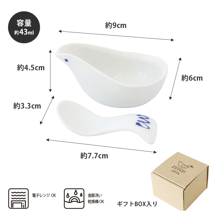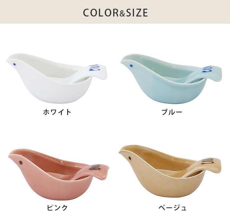 サイズ本体:W6 × D9 × H4.5cmスプーン:3.3 × 7.7cm容量43ml重量約121g材質磁器シリーズviv製造元ワールドクリエイト生産国日本備考○電子レンジ使用可○食洗機使用可○手作りの為、色・風合いに多少のバラつきがある場合がございます。かわいい小鳥の形をした、波佐見焼のソースポット可愛らしいことりの形をしたソース入れ。くちばしが注ぎ口になっているので、そのまま本体を傾ければソースやドレッシングも注ぎやすい形状です。コーヒーや紅茶に添える砂糖やジャムは、尾っぽのスプーンを使ってすくうことができます。さまざまな使い方ができて、見た目にも癒されるポットです。