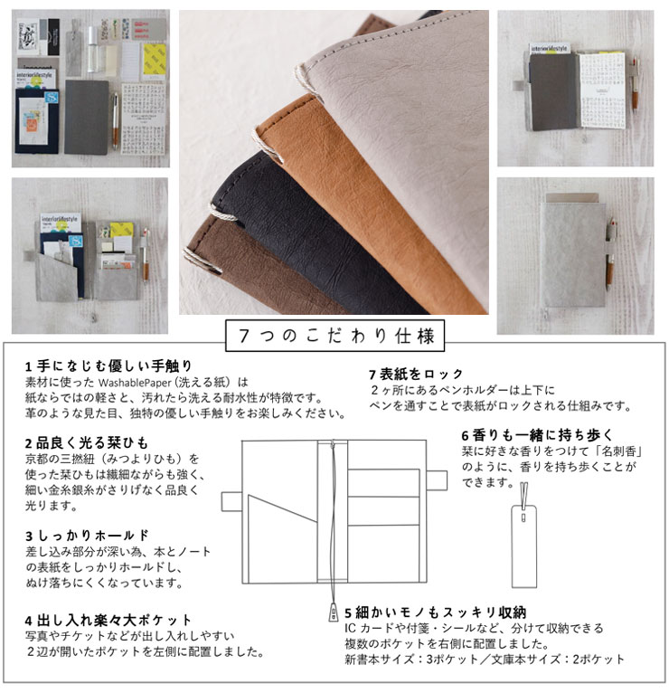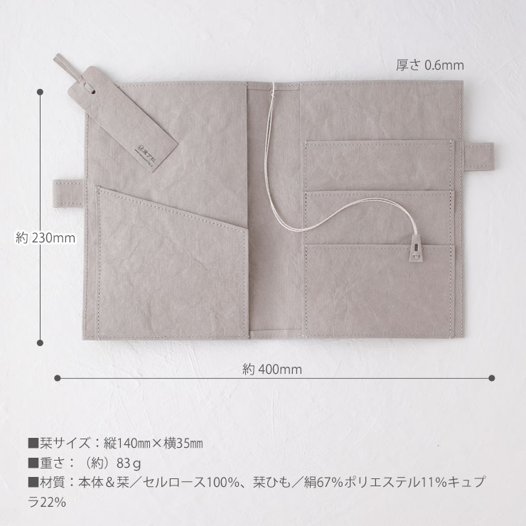 サイズ本体(開いた状態):(約)縦230×横400×厚さ0.6mm(ペンホルダー含む)栞:縦140×横35mm対応サイズ2冊合わせた厚さ 最大25mmまで収納可能重量約83g材質本体&栞:セルロース100%栞ひも:絹67%、ポリエステル11%、キュプラ22%製造元WPBヨーロッパのヴィンテージ壁紙に魅せられ、「Enjoy the WALLPAPER」をコンセプトに、女性2人で立ち上げたブランド。輸入壁紙と異素材を組み合わせたバッグや雑貨を製作している他、ドイツ製ボンデッドレザーを用いた実用品なども新たに展開中。実用性のある商品、丁寧なものづくりを心掛けているメーカーです。お手入れについて●洗う場合は、栞ひもを外してから、中性洗剤で手洗いし、陰干ししてください。●ドライクリーニング不可、耐水ですが、防水加工はしていません。備考●日本製●ハードカバー本には適していません。大切な本とノートを一緒に持ち歩くためのカバー