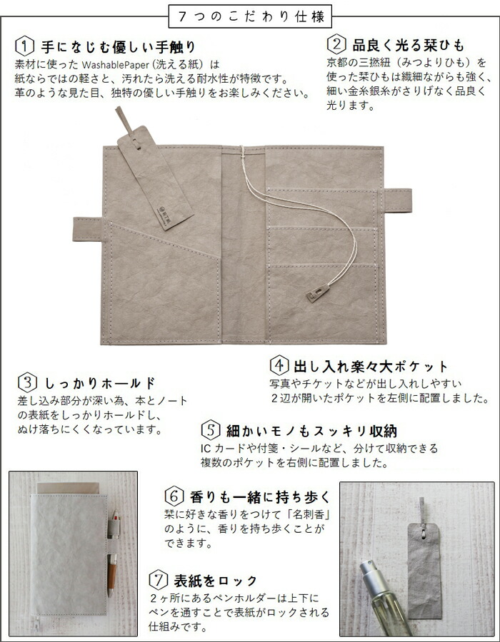 サイズ本体(開いた状態):(約)縦210×横358×厚さ0.6mm(ペンホルダー含む)栞:縦140×横35mm重量(約)75g材質本体&栞:セルロース100%栞ひも:絹67%、ポリエステル11%、キュプラ22%製造元WPBヨーロッパのヴィンテージ壁紙に魅せられ、「Enjoy the WALLPAPER」をコンセプトに、女性2人で立ち上げたブランド。輸入壁紙と異素材を組み合わせたバッグや雑貨を製作している他、ドイツ製ボンデッドレザーを用いた実用品なども新たに展開中。実用性のある商品、丁寧なものづくりを心掛けているメーカーです。お手入れについて●洗う場合は、栞ひもを外してから、中性洗剤で手洗いし、陰干ししてください。●ドライクリーニング不可、耐水ですが、防水加工はしていません。備考●日本製大切な本とノートを一緒に持ち歩くためのカバー