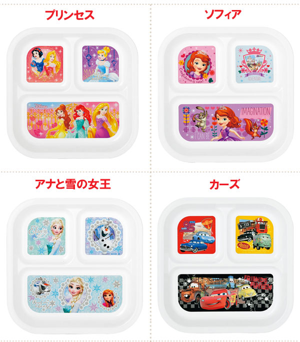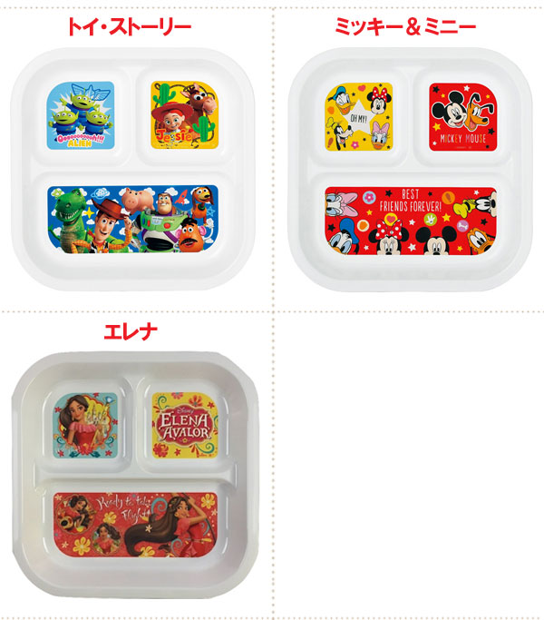 バリエーションプリンセス/ソフィアアナと雪の女王/カーズトイ・ストーリー/ミッキー&ミニー/エレナ材質飽和ポリエステル樹脂サイズ約22×22×2.6cm商品説明仕切りがあり、盛り付けしやすいランチプレート。ある程度深さがあるので、スプーンなどすくいやすく食べやすい形です。人気のディズニーキャラクターと一緒だとお食事タイムがますます楽しくなります。製造YAXELL(ヤクセル)備考●食器洗い乾燥機や電子レンジではご使用いただけません。●製品の温度が80℃を超えますと絵付け部のインクが溶出する恐れがあります。(溶出したインクは人体に影響はありません)ディズニー スクエアランチプレート