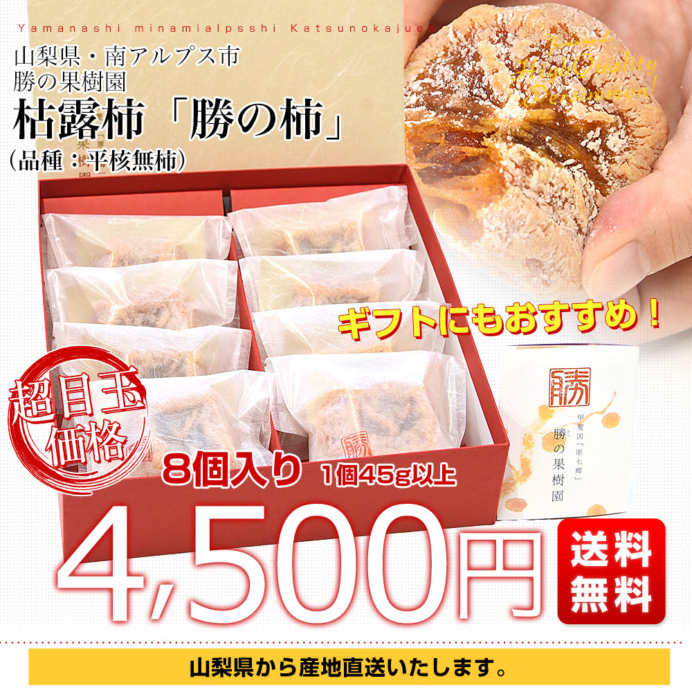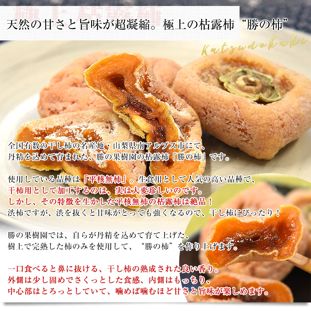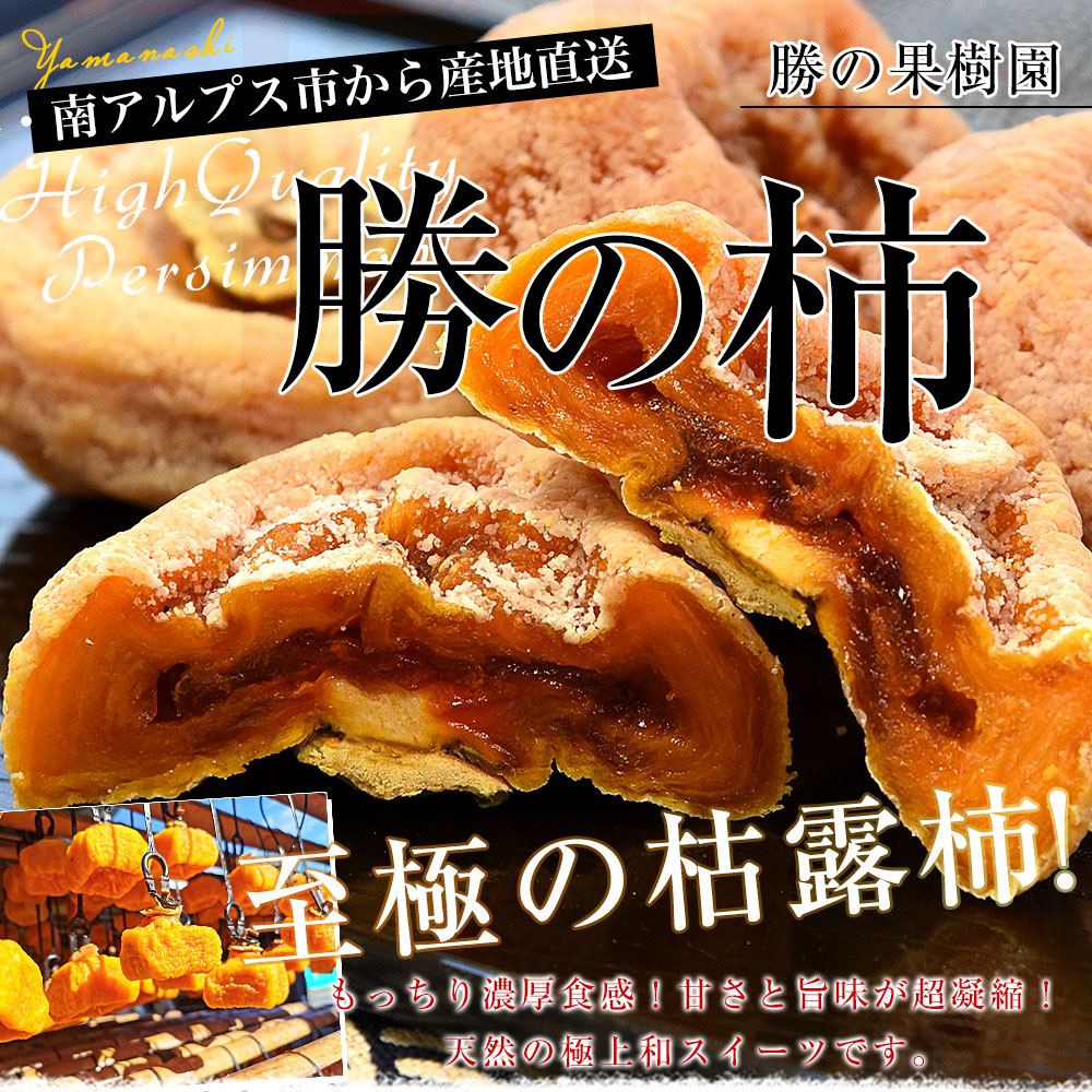 発送時期:12月15日から12月27日 山梨県から産地直送いたします。 商品名:勝の柿(枯露柿) 内容量:8個入り(1個45g以上) 原産地:山梨県勝の果樹園 山梨県南アルプス市の勝の果樹園の「勝の柿」。平核無柿を使った、珍しい枯露柿になります。鼻に抜ける柿の熟成された、天然の甘い香り。もっちりとした食感で、甘さと旨味が超凝縮されています。干し柿農家が本当においしいと思う干し柿を作りたい、そんな生産者の熱い思いで完成された逸品です。 <沖縄県と一部離島への配送について> 誠に勝手ながら、沖縄県や一部離島への配送は承っておりません。配送を希望される場合は、別途運賃・1380円をご請求いたしますのでご了承ください。 <商品の規格・重量などについて> 当店で扱う青果物は、性質上、味わいや大きさ、重みに個体差がございます。そのため、重量が多少前後することや若干のバラつきがでることもございますのでその点はご了承ください。 <沖縄県と一部離島への配送について> 誠に勝手ながら、沖縄県や一部離島への配送は承っておりません。配送を希望される場合は、別途運賃・1380円をご請求いたしますのでご了承ください。 <クール発送について> 一部地域においては、クールでの発送ができない地域もございます。クールでの発送ができない地域のご注文は、承れない場合がありますので、ご了承ください。 <レビュー記入時期のお願い> レビュー記入のお願いが商品の発送よりも前にシステム上、自動的に発信されることがありますが、「商品到着後」にレビューを記載していただきますようお願いいたします。