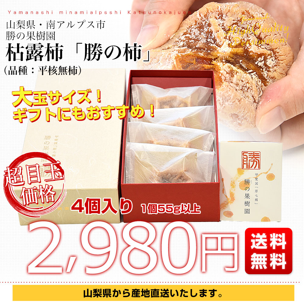 発送時期:12月15日から12月27日 山梨県から産地直送いたします。 商品名:勝の柿(枯露柿) 内容量:4個入り(1個55g以上) 原産地:山梨県勝の果樹園 山梨県南アルプス市の勝の果樹園の「勝の柿」。平核無柿を使った、珍しい枯露柿になります。鼻に抜ける柿の熟成された、天然の甘い香り。もっちりとした食感で、甘さと旨味が超凝縮されています。干し柿農家が本当においしいと思う干し柿を作りたい、そんな生産者の熱い思いで完成された逸品です。 <沖縄県と一部離島への配送について> 誠に勝手ながら、沖縄県や一部離島への配送は承っておりません。配送を希望される場合は、別途運賃・1380円をご請求いたしますのでご了承ください。 <商品の規格・重量などについて> 当店で扱う青果物は、性質上、味わいや大きさ、重みに個体差がございます。そのため、重量が多少前後することや若干のバラつきがでることもございますのでその点はご了承ください。 <沖縄県と一部離島への配送について> 誠に勝手ながら、沖縄県や一部離島への配送は承っておりません。配送を希望される場合は、別途運賃・1380円をご請求いたしますのでご了承ください。 <クール発送について> 一部地域においては、クールでの発送ができない地域もございます。クールでの発送ができない地域のご注文は、承れない場合がありますので、ご了承ください。 <レビュー記入時期のお願い> レビュー記入のお願いが商品の発送よりも前にシステム上、自動的に発信されることがありますが、「商品到着後」にレビューを記載していただきますようお願いいたします。