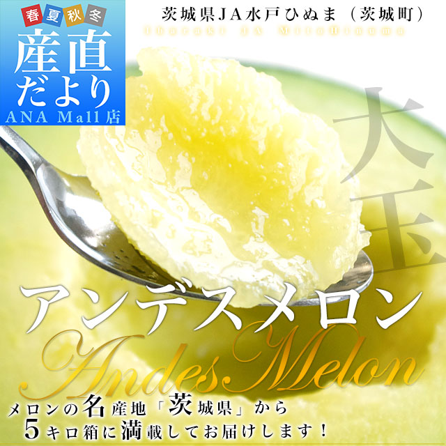 発送時期:販売を終了しました。 茨城県JA水戸ひぬまより産地直送します。 名称:メロン(アンデスメロン) 産地:茨城県 内容量:5キロ箱(4Lから3L:3玉から4玉入り) いつ買って食べても「あんしんです」ということから、命名されたアンデスメロン。網目のあるネット系メロンの代表的な品種です。青い果肉は、芳醇な香りに包まれて、まろやかでコクのあるメロンで人気です。食べごろは、香りと弾力を感じるころ、お尻の部分が柔らかくなってきたころが食べ時です。 <商品の規格・重量などについて> 当店で扱う青果物は、性質上、味わいや大きさ、重みに個体差がございます。そのため、重量が多少前後することや若干のバラつきがでることもございますのでその点はご了承ください。 <沖縄県と一部離島への配送について> 誠に勝手ながら、沖縄県や一部離島への配送は承っておりません。配送を希望される場合は、別途運賃・1380円をご請求いたしますのでご了承ください。 <クール発送について> 一部地域においては、クールでの発送ができない地域もございます。クールでの発送ができない地域のご注文は、承れない場合がありますので、ご了承ください。 <レビュー記入時期のお願い> レビュー記入のお願いが商品の発送よりも前にシステム上、自動的に発信されることがありますが、「商品到着後」にレビューを記載していただきますようお願いいたします。