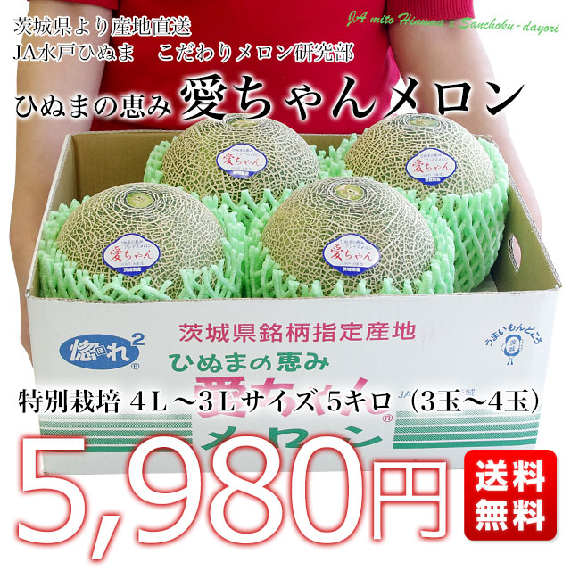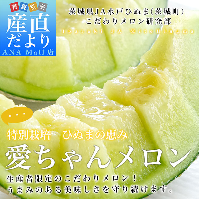 発送時期:販売を終了しました。 茨城県JA水戸ひぬまより産地直送します。 名称:特別栽培メロン 愛ちゃん 産地:茨城県 内容量:5キロ箱(4Lから3Lサイズ:3玉から4玉入り) 「ひぬまの恵み 愛ちゃん」アンデスメロンの原種の味わい・旨さを残したいとこだわりメロン作りに取り組み、昔ながらの美味しいメロンをこだわり持って作り続けます。 <商品の規格・重量などについて> 当店で扱う青果物は、性質上、味わいや大きさ、重みに個体差がございます。そのため、重量が多少前後することや若干のバラつきがでることもございますのでその点はご了承ください。 <沖縄県と一部離島への配送について> 沖縄県や離島・一部地域への配送は、別途運賃・1380円がかかります。