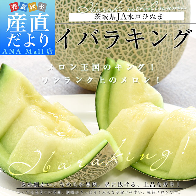 発送時期:販売を終了しました。 茨城県JA水戸ひぬまより産地直送します。 商品名:イバラキング 原産地:茨城県 内容量:5キロ箱(3玉から4玉) 等級:優品以上 メロン王国・茨城県のオリジナル品種・イバラキング!「茨城メロンのキングになってほしい」そんな想いを込め、2010年に品種登録されました。きめ細かく、舌触り良い果肉。味わいはとても甘く、鼻に抜ける良い香り!甘みが強いですが、不思議と後味はさっぱりとして、クセのない食べやすいメロンです! <商品の規格・重量などについて> 当店で扱う青果物は、性質上、味わいや大きさ、重みに個体差がございます。そのため、重量が多少前後することや若干のバラつきがでることもございますのでその点はご了承ください。 <沖縄県と一部離島への配送について> 誠に勝手ながら、沖縄県や一部離島への配送は承っておりません。配送を希望される場合は、別途運賃・1380円をご請求いたしますのでご了承ください。