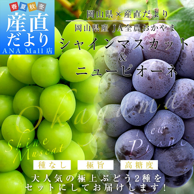 発送時期:販売を終了しました。 東京都大田市場より発送いたします。 名称:ぶどう(シャインマスカット1房、ニューピオーネ1房) 産地:岡山県 内容量:合計約1.2キロ(2房) 大人気ぶどう2種セットをお届けします。とっても甘くて種なし、丸ごと食べられる「シャインマスカット」と、大粒の果粒に甘い果汁がたっぷり、芳醇な味わいの「ニューピオーネ」を入れた大満足セット!こだわりの極上ぶどうをどうぞお楽しみください。 <商品の規格・重量などについて> 当店で扱う青果物は、性質上、味わいや大きさ、重みに個体差がございます。そのため、重量が多少前後することや若干のバラつきがでることもございますのでその点はご了承ください。 <沖縄県と一部離島への配送について> 誠に勝手ながら、沖縄県や一部離島への配送は承っておりません。配送を希望される場合は、別途運賃・1380円をご請求いたしますのでご了承ください。 <クール発送について> 一部地域においては、クールでの発送ができない地域もございます。クールでの発送ができない地域のご注文は、承れない場合がありますので、ご了承ください。 <レビュー記入時期のお願い> レビュー記入のお願いが商品の発送よりも前にシステム上、自動的に発信されることがありますが、「商品到着後」にレビューを記載していただきますようお願いいたします。