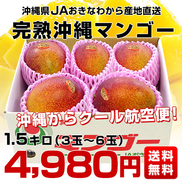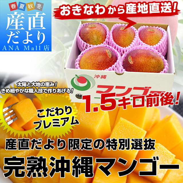 発送時期:販売を終了しました。 沖縄県JAおきなわより産地直送します 商品名:マンゴー 内容量:約1.5キロ(3玉から6玉入) 原産地:沖縄県 産直だより特別選別マンゴーは、まさに、味優先のセレクトです。 風のいたずらもあり、外観でのA品には、惜しくもなれませんでした。 しかしながら、選果場にてすべての検査に合格した正規品です。ご自宅用にも、ギフトにもご利用ください。 <商品の規格・重量などについて> 当店で扱う青果物は、性質上、味わいや大きさ、重みに個体差がございます。そのため、重量が多少前後することや若干のバラつきがでることもございますのでその点はご了承ください。 <沖縄県と一部離島への配送について> 誠に勝手ながら、沖縄県や一部離島への配送は承っておりません。配送を希望される場合は、別途運賃・1380円をご請求いたしますのでご了承ください。