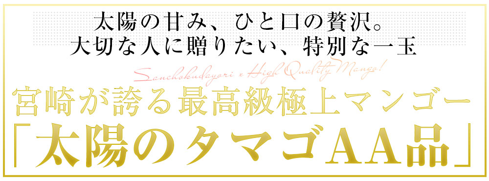 発送時期:4月20日から4月30日 宮崎県 JAみやざき宮崎中央地区本部から産地直送します 商品名:マンゴー 太陽のタマゴ 最高級AA品 内容量:3Lサイズ×2玉(450gから499g×2玉) 産地:宮崎県 マンゴーの王様と称される、宮崎県が誇る最高級ブランドマンゴー「太陽のタマゴ」。その中でも厳しい基準をクリアした AAランク品 を厳選してお届けします。南国・宮崎の太陽をたっぷり浴びて育った果実は、ひと口食べると とろけるような果肉と濃厚な甘み が広がり、芳醇な香りが口いっぱいに広がります。繊維が少なく、なめらかな口当たりはまさに極上。まるで高級スイーツのような贅沢な味わいです。大切な方への贈り物、特別な日のギフトに最適です。数量が限られる 希少な最高級マンゴーです。 <商品の規格・重量などについて> 当店で扱う青果物は、性質上、味わいや大きさ、重みに個体差がございます。そのため、重量が多少前後することや若干のバラつきがでることもございますのでその点はご了承ください。 <沖縄県と一部離島への配送について> 誠に勝手ながら、沖縄県や一部離島への配送は承っておりません。配送を希望される場合は、別途運賃・1380円をご請求いたしますのでご了承ください。 <クール発送について> 一部地域においては、クールでの発送ができない地域もございます。クールでの発送ができない地域のご注文は、承れない場合がありますので、ご了承ください。 <レビュー記入時期のお願い> レビュー記入のお願いが商品の発送よりも前にシステム上、自動的に発信されることがありますが、「商品到着後」にレビューを記載していただきますようお願いいたします。