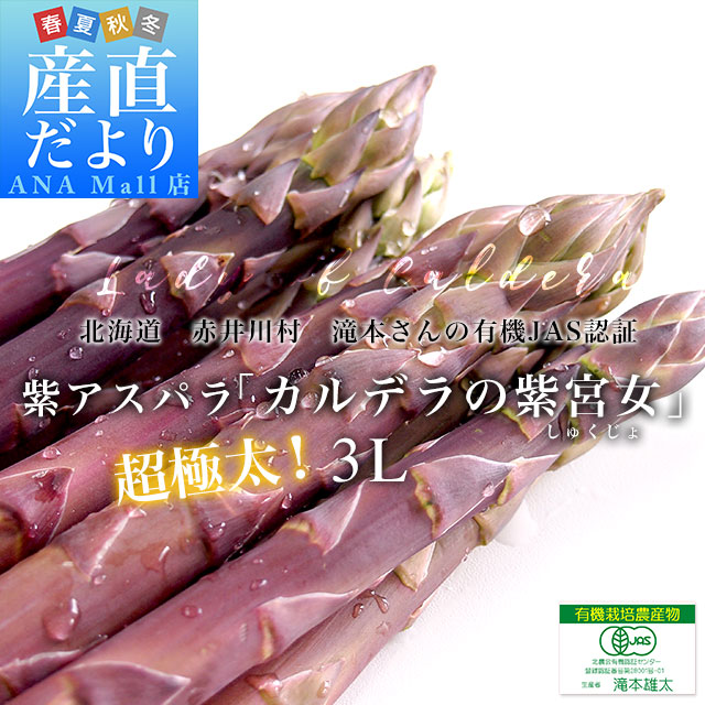 発送時期:販売を終了しました。 北海道 滝本農場より産地直送します。 商品名:紫アスパラ 3Lサイズ 内容量:500g(目安:7本から10本) 産地:北海道 旬の柔らかい有機栽培アスパラをお届けします。周りを山に囲まれ、寒暖差の激しい北海道の赤井川村、とっても美味しいアスパラが育ちます。お客様に安心して召し上がっていただくため、JAS有機認定を受けて完全無農薬でアスパラを作り続ける滝本さんのアスパラです。 <商品の規格・重量などについて> 当店で扱う青果物は、性質上、味わいや大きさ、重みに個体差がございます。そのため、重量が多少前後することや若干のバラつきがでることもございますのでその点はご了承ください。 <沖縄県と一部離島への配送について> 誠に勝手ながら、沖縄県や一部離島への配送は承っておりません。配送を希望される場合は、別途運賃・1380円をご請求いたしますのでご了承ください。 <クール発送について> 一部地域においては、クールでの発送ができない地域もございます。クールでの発送ができない地域のご注文は、承れない場合がありますので、ご了承ください。 <レビュー記入時期のお願い> レビュー記入のお願いが商品の発送よりも前にシステム上、自動的に発信されることがありますが、「商品到着後」にレビューを記載していただきますようお願いいたします。