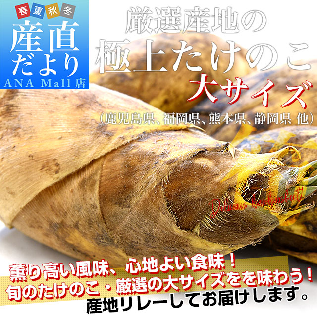 発送時期:販売を終了しました。 東京都大田市場より発送いたします。 商品名:たけのこ 内容量:約2キロ(2本から4本前後) 原産地:鹿児島県、熊本県、福岡県、静岡県 他 (ご注文時期に応じて旬の産地を厳選してお届け致します。) 初夏の到来を感じさせるタケノコは、まさに旬の恵み!食べ応え抜群の大サイズをお届けいたします。ほのかな甘みを感じる風味と心地よい歯触りをお楽しみください。 <商品の規格・重量などについて> 当店で扱う青果物は、性質上、味わいや大きさ、重みに個体差がございます。そのため、重量が多少前後することや若干のバラつきがでることもございますのでその点はご了承ください。 <沖縄県と一部離島への配送について> 誠に勝手ながら、沖縄県や一部離島への配送は承っておりません。配送を希望される場合は、別途運賃・1380円をご請求いたしますのでご了承ください。 <クール発送について> 一部地域においては、クールでの発送ができない地域もございます。クールでの発送ができない地域のご注文は、承れない場合がありますので、ご了承ください。 <レビュー記入時期のお願い> レビュー記入のお願いが商品の発送よりも前にシステム上、自動的に発信されることがありますが、「商品到着後」にレビューを記載していただきますようお願いいたします。