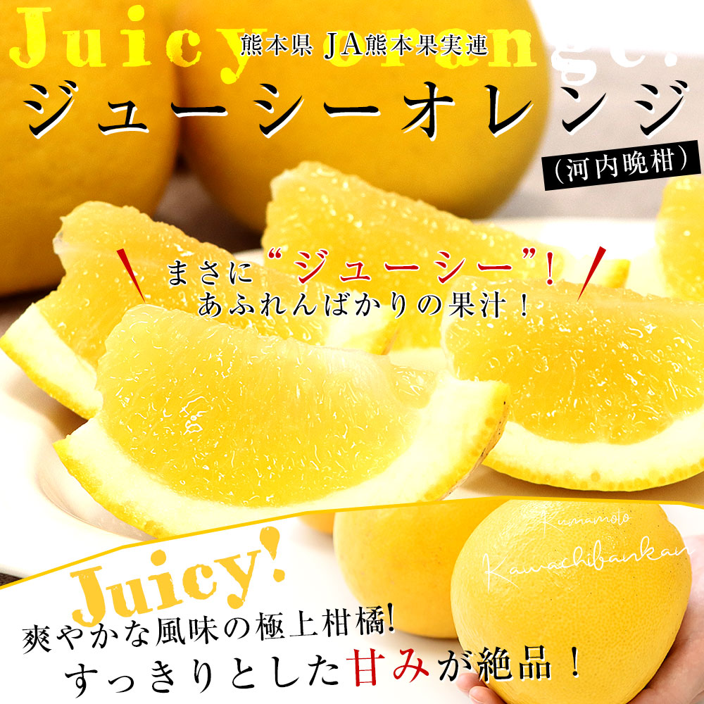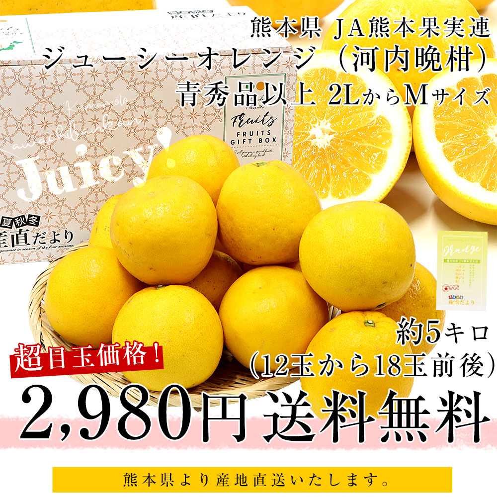 発送時期:3月16日から3月28日 熊本県より産地直送します。 商品名:ジューシーオレンジ 原産地:熊本県 内容量:約5キロ(12玉から18玉前後) たっぷりの果汁とスッキリした甘み。密かにファンが増え続ける、まるで和製グレープフルーツ!爽やかな香りと上品な味わいで、口当たりもソフトだからとっても食べやすいのです。半分にカットしてスプーンですくっても良し。スマイルカットにしても良し。この美味!ぜひご賞味ください。 <商品の規格・重量などについて> 当店で扱う青果物は、性質上、味わいや大きさ、重みに個体差がございます。そのため、重量が多少前後することや若干のバラつきがでることもございますのでその点はご了承ください。 <沖縄県と一部離島への配送について> 誠に勝手ながら、沖縄県や一部離島への配送は承っておりません。配送を希望される場合は、別途運賃・1380円をご請求いたしますのでご了承ください。 <クール発送について> 一部地域においては、クールでの発送ができない地域もございます。クールでの発送ができない地域のご注文は、承れない場合がありますので、ご了承ください。 <レビュー記入時期のお願い> レビュー記入のお願いが商品の発送よりも前にシステム上、自動的に発信されることがありますが、「商品到着後」にレビューを記載していただきますようお願いいたします。