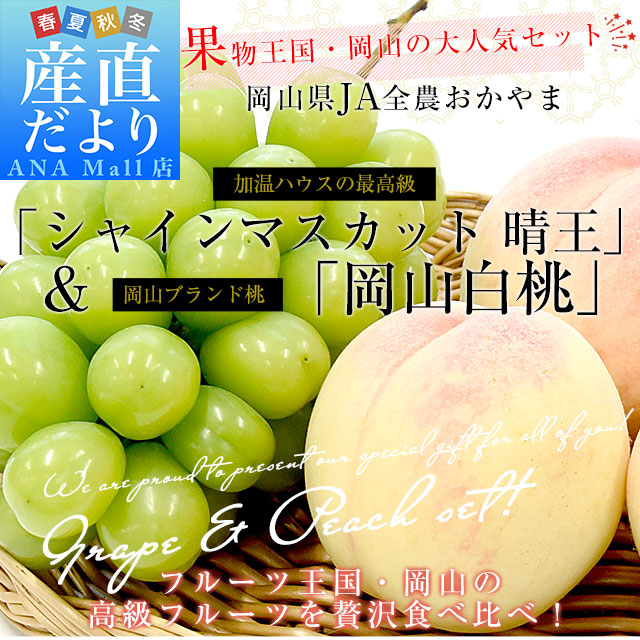 発送時期:販売を終了しました。 東京都大田市場より発送いたします。 商品名:ハウス栽培シャインマスカット晴王&岡山白桃 エース 原産地:岡山県 内容量:シャインマスカット1房(600g)&岡山白桃エース4玉(約1.1キロ) 岡山を代表する大人気フルーツのセット!とっても甘くて種なし丸ごと食べられるシャインマスカット。甘く優しい香りジューシーでとろけるような岡山白桃。人気のフルーツをセットでお届けします。 <沖縄県と一部離島への配送について> 誠に勝手ながら、沖縄県や一部離島への配送は承っておりません。配送を希望される場合は、別途運賃・1380円をご請求いたしますのでご了承ください。 <クール発送について> 一部地域においては、クールでの発送ができない地域もございます。クールでの発送ができない地域のご注文は、承れない場合がありますので、ご了承ください。 <沖縄県と一部離島への配送について> 誠に勝手ながら、沖縄県や一部離島への配送は承っておりません。配送を希望される場合は、別途運賃・1380円をご請求いたしますのでご了承ください。 <レビュー記入時期のお願い> レビュー記入のお願いが商品の発送よりも前にシステム上、自動的に発信されることがありますが、「商品到着後」にレビューを記載していただきますようお願いいたします。