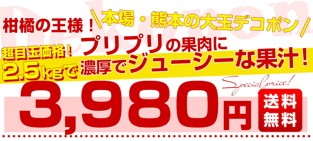 発送時期:1月19日から1月31日 東京都大田市場より発送いたします。 商品名:デコポン 優品 原産地:熊本県 内容量:約2.5キロ(7玉から10玉) 本場・熊本の美味しいデコポン!味わいがとても濃く、酸味が少なく、甘さたっぷり!デコポンは〈酸度1%以下、糖度13度以上〉という1つの基準をもった果物。大玉ですので食べ応えも抜群です!口に入れた途端広がる、濃いジューシーな甘い果汁を存分にお楽しみください! <商品の規格・重量などについて> 当店で扱う青果物は、性質上、味わいや大きさ、重みに個体差がございます。そのため、重量が多少前後することや若干のバラつきがでることもございますのでその点はご了承ください。 <沖縄県と一部離島への配送について> 誠に勝手ながら、沖縄県や一部離島への配送は承っておりません。配送を希望される場合は、別途運賃・1380円をご請求いたしますのでご了承ください。 <クール発送について> 一部地域においては、クールでの発送ができない地域もございます。クールでの発送ができない地域のご注文は、承れない場合がありますので、ご了承ください。 <レビュー記入時期のお願い> レビュー記入のお願いが商品の発送よりも前にシステム上、自動的に発信されることがありますが、「商品到着後」にレビューを記載していただきますようお願いいたします。