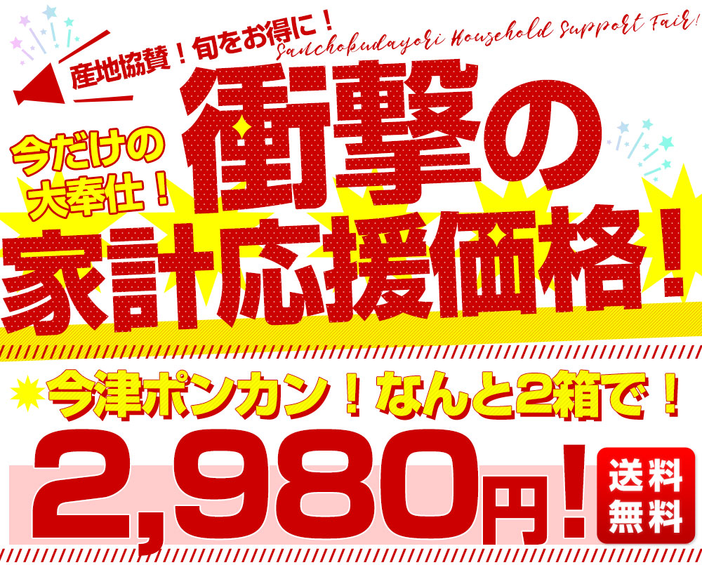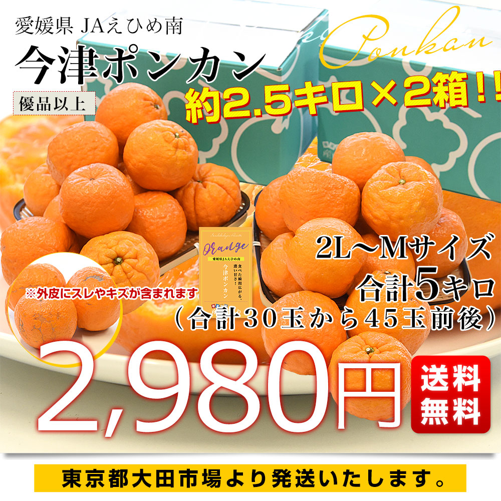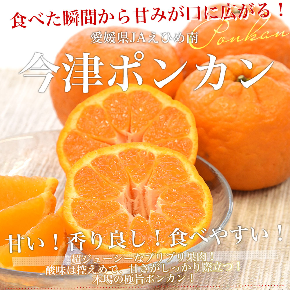発送時期:販売を終了しました。 東京都大田市場より発送いたします。 商品名:今津ポンカン 内容量:約2.5キロ×2箱 原産地:愛媛県 豊かな香りと、濃厚な甘さに包まれる絶品柑橘「今津ポンカン」。ポンカンの本場・愛媛県宇和島市にて今津氏が栽培を始めたことが名前の由来。通常のポンカンよりも、果皮が少し濃い色をしていて、爽やかないい香りと、まろやかな甘味が強く、酸味は弱め!手で簡単にむくことができ、ポンカン本来の甘さを存分に楽しむことができます。 <商品の規格・重量などについて> 当店で扱う青果物は、性質上、味わいや大きさ、重みに個体差がございます。そのため、重量が多少前後することや若干のバラつきがでることもございますのでその点はご了承ください。 <沖縄県と一部離島への配送について> 誠に勝手ながら、沖縄県や一部離島への配送は承っておりません。配送を希望される場合は、別途運賃・1380円をご請求いたしますのでご了承ください。 <クール発送について> 一部地域においては、クールでの発送ができない地域もございます。クールでの発送ができない地域のご注文は、承れない場合がありますので、ご了承ください。 <レビュー記入時期のお願い> レビュー記入のお願いが商品の発送よりも前にシステム上、自動的に発信されることがありますが、「商品到着後」にレビューを記載していただきますようお願いいたします。